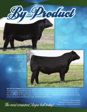 MCATL By-Product is an outstanding herd sire that can be used in a variety of ways. He works not only on Purebred Angus cattle but has really clicked with Purebred Simmentals. By-Product calves are born with a ton of hair, a ton of vigor, and awesome blend of both muscle and style which mature into very easy doing, functional cattle. By Product is clean of ALL KNOWN GENETIC DEFECTS and is a great outcross to some of the most popular bulls like First Class, First Rate, and Brilliance.