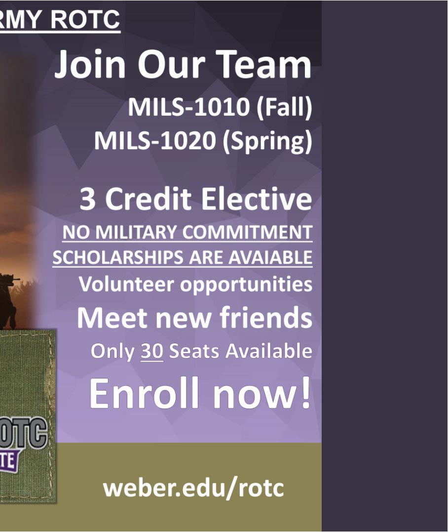 DECIDE TO LEAD. ©2023 U.S. ARMY. PAID FOR BY THE U.S. ARMY. WE GIVE YOU THE SKILLS. YOU DECIDE WHERE THEY TAKE YOU. Make the most of your potential with training, tools, and mentorship. Develop your skill set while pushing your abilities to the next level. For more info about Weber State Army ROTC, contact Clyde Ratliff at (801) 626-8609, or email clyderatliff1@weber.edu. Visit us at weber.edu/rotc.