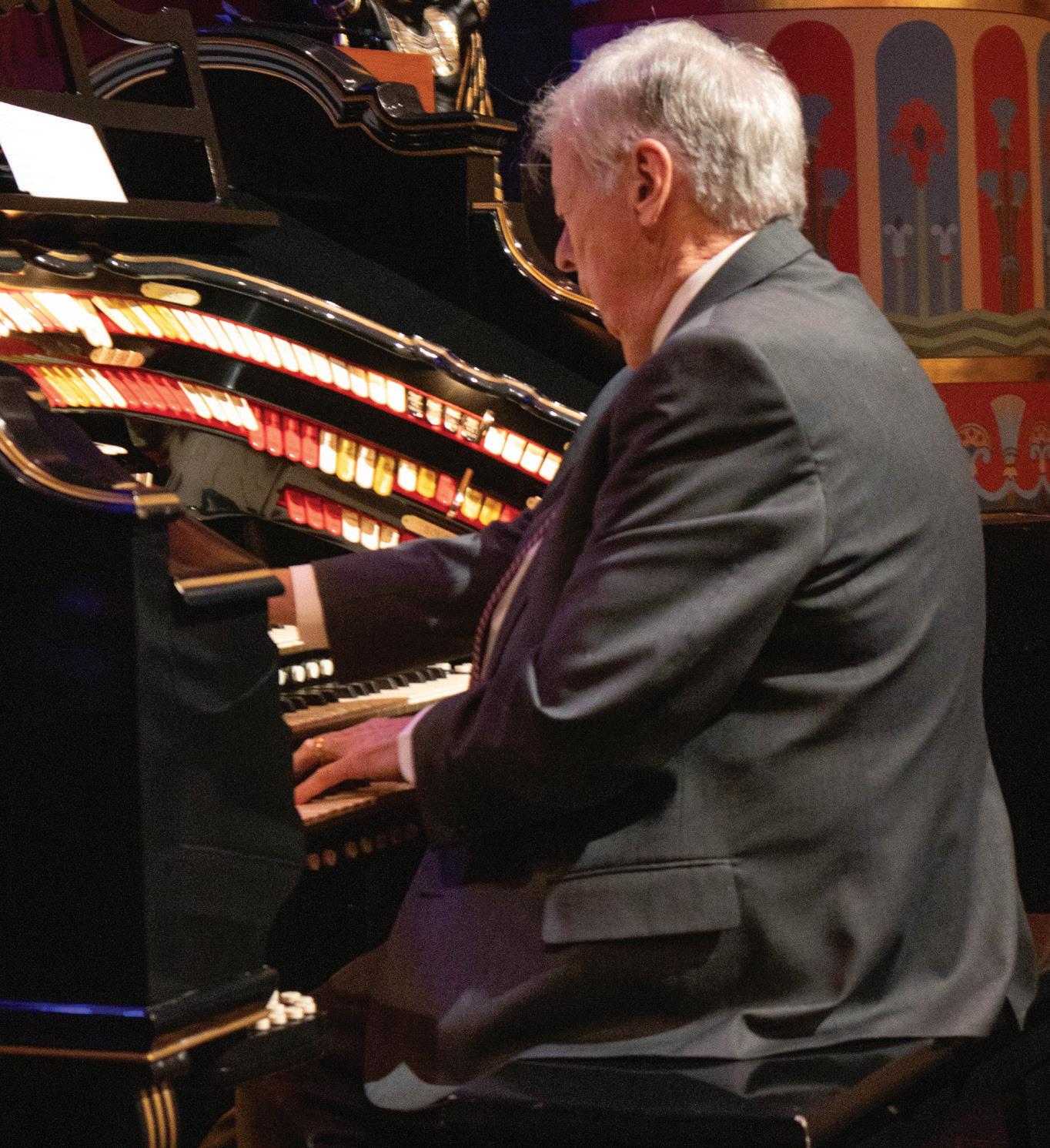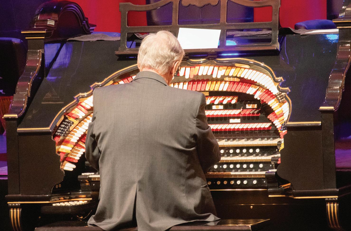 With his back to the crowd, the organist plays keys and pushes levers to form sound.