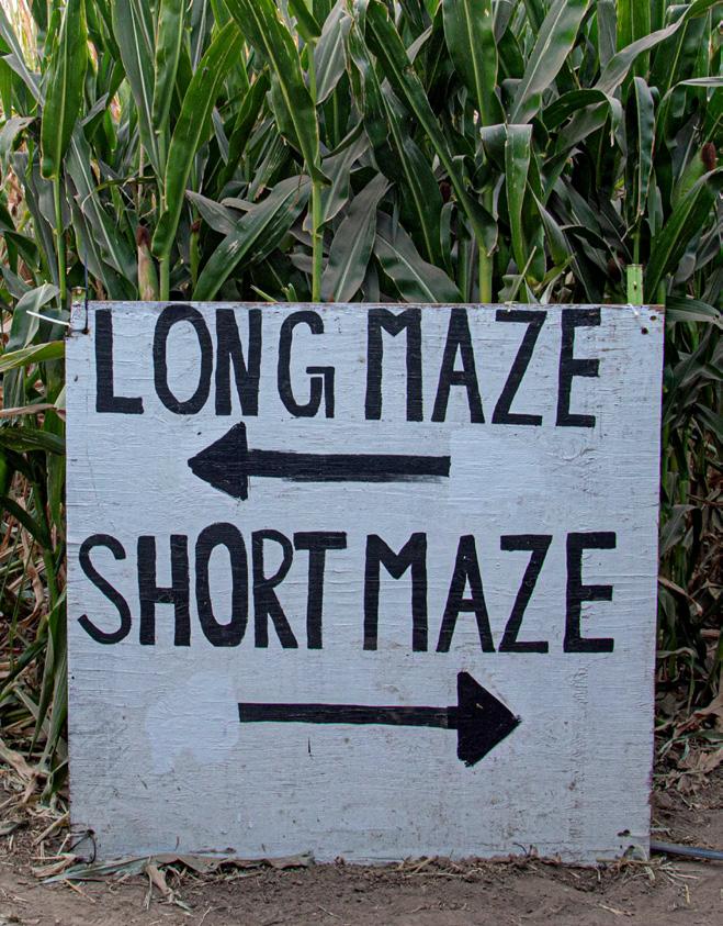 TOP LEFT: The decorative scenes are meticulously crafted and consistent with the Halloween and fall themes. MIDDLE LEFT: There will be two path options for the player, turn right for the short path and turn left for the long path. BOTTOM LEFT: Visitors can buy food and feed the animals. TOP RIGHT: The decorations at the corn maze really captured the vibe of the event. BOTTOM RIGHT: One of the animals present at the corn maze