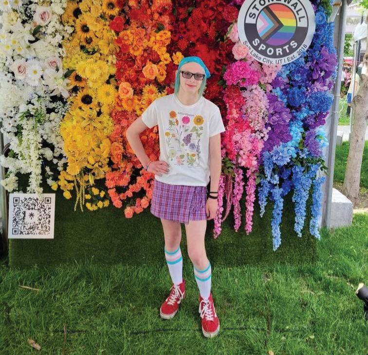 Left: Terra posing with a can of gender fluid in omega-mart. Right: Terra posing during salt lake city pride.