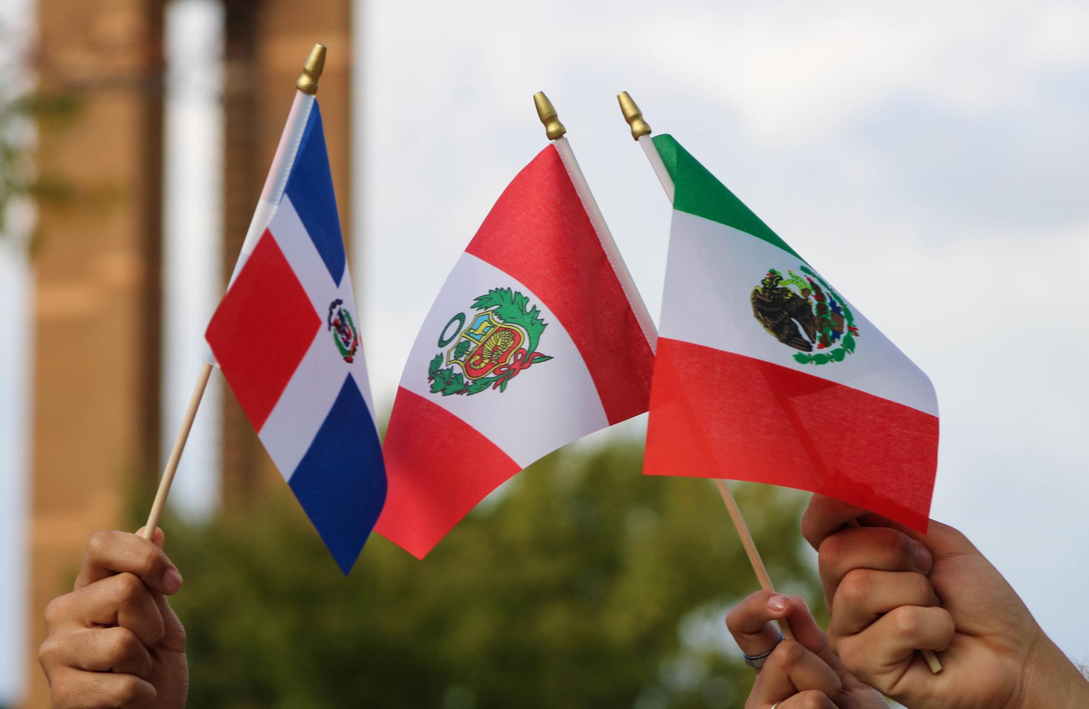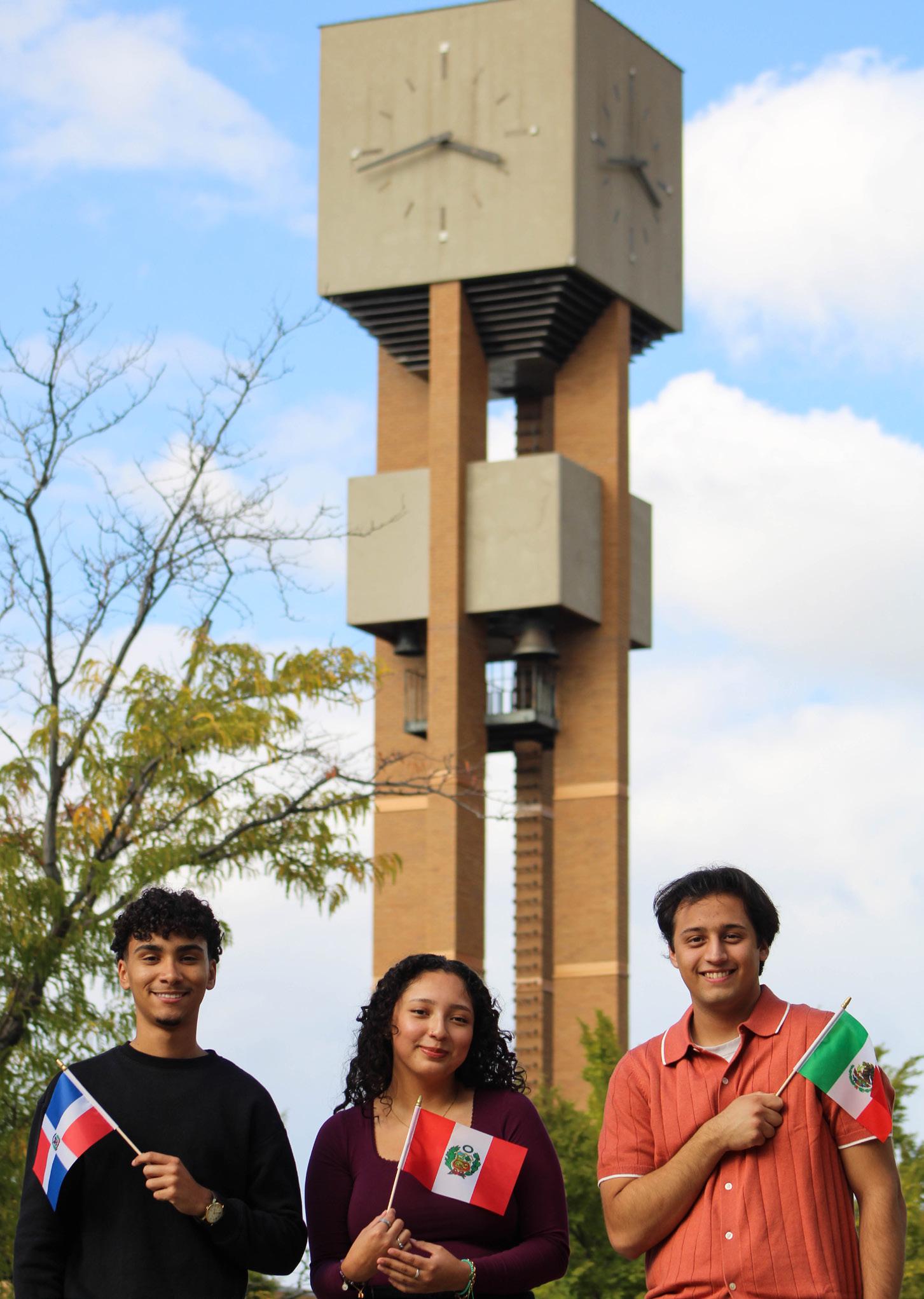 Weber State University Collaboration Editor Bryce Odenthall holds up a Dominican Republican flag, Editor-in-Chief Nelly Hernandez holds up a Peruvian flag and Managing Editor James Gordon holds up a Mexican