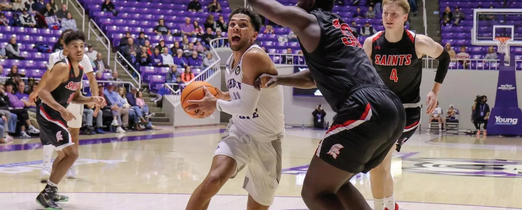 Steven Verplancken running towards the hoop for a shot against Saint Martins’s University on Dec. 10.