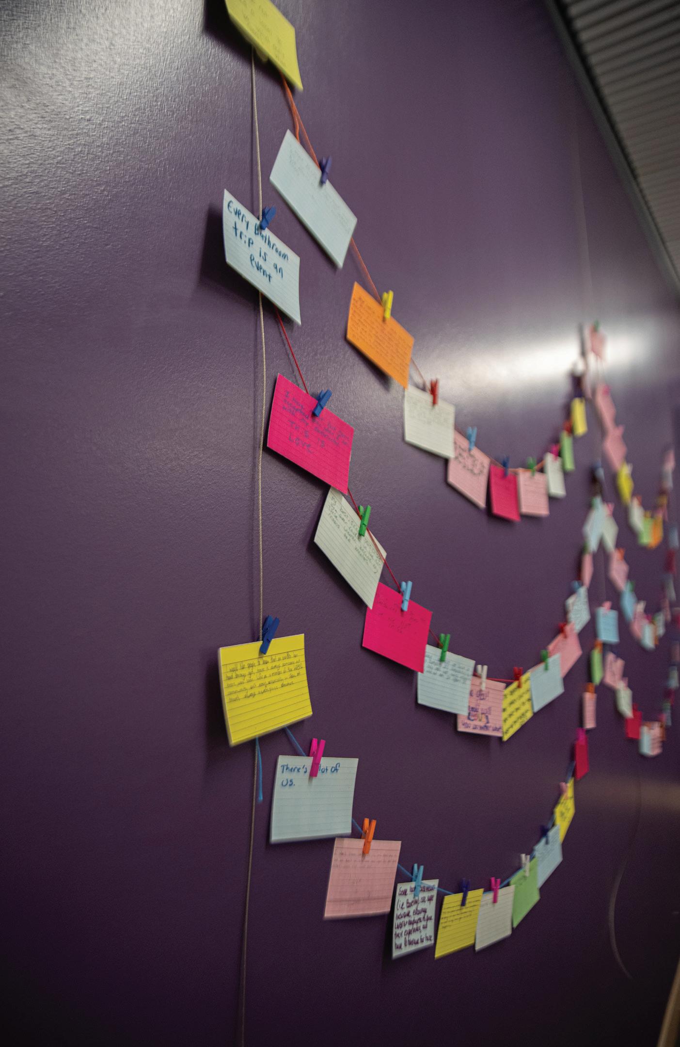 Rainbow Letters Exhibit wall displaying different colored letters written by attendees about their experience being a member of the LGBTQ community.