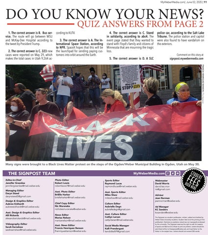 Webmaster David Morris david.lee.morris@gmail.com Adviser Jean Norman jeannorman@weber.edu Ad Manager KC Sanders kcsanders@weber.edu The Signpost is a student publication, written, edited and drafted by Weber State University students. Student fees fund the printing of this publication. Opinions or positions voiced are not necessarily endorsed by the university. The Signpost reserves the right to edit for reasons of space and libel and to refuse to print any letters. Letters should be submitted online to thesignpost@weber.edu and read letter to the Editor in the subject box. Letters should not exceed 350 words.