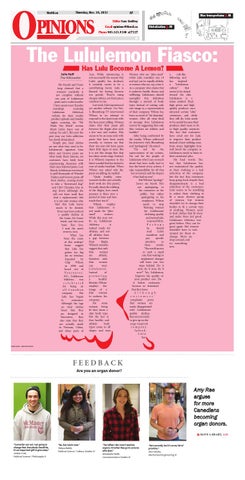 Women who are “plus-sized” (what Lulu considers size 14 and up) can be equally athletic as women who are, say, a size 4. As a company who claims that it endorses health, fitness and wellbeing, Lululemon should exemplify this definition through a myriad of body types instead of casting only one image as a representation of their company. Wilson has been accused of “fat shaming” women. After all, what kind of message does Lululemon convey by suggesting that only thin women are athletic and healthy? After being confronted by the media, Wilson addressed his interview with Bloomberg and “apologized.” He stated: “I’m sad for the repercussions of my actions, I’m sad for the people of Lululemon who I care so much about that have really had to face the brunt of my actions. I take responsibility for all that has occurred, and the impact it has had on you.” But Wilson’s “apology” leaves me bereft. He’s not apologizing to his customers or the public, but rather apologizing to his employees. Wilson needs to stop blaming women for Lululemon’s declining quality and instead take responsibility. P e r h a p s he should read Lulu’s manifesto and pay specific attention to these words: “The world moves at such a rapid rate that waiting to implement changes will leave you two steps behind. Do it now, do it now, do it now!” Yes, Lululemon. Improve the quality of your product now. Do it before customers become so frustrated that they leave. A l t h o u g h c u s t o m e r s’ complaints prove that women are sorely disappointed with Lululemon’s quality decline, they are not ready to give up on the yoga-inspired c o m p a ny. Indeed, Lulu has