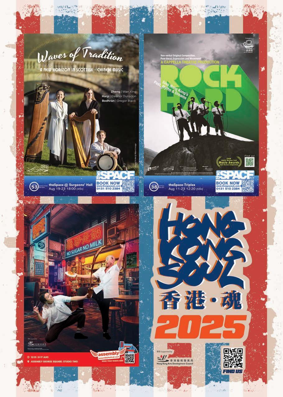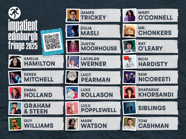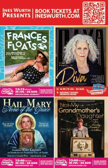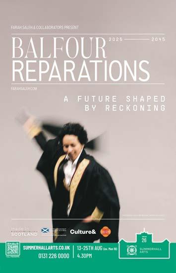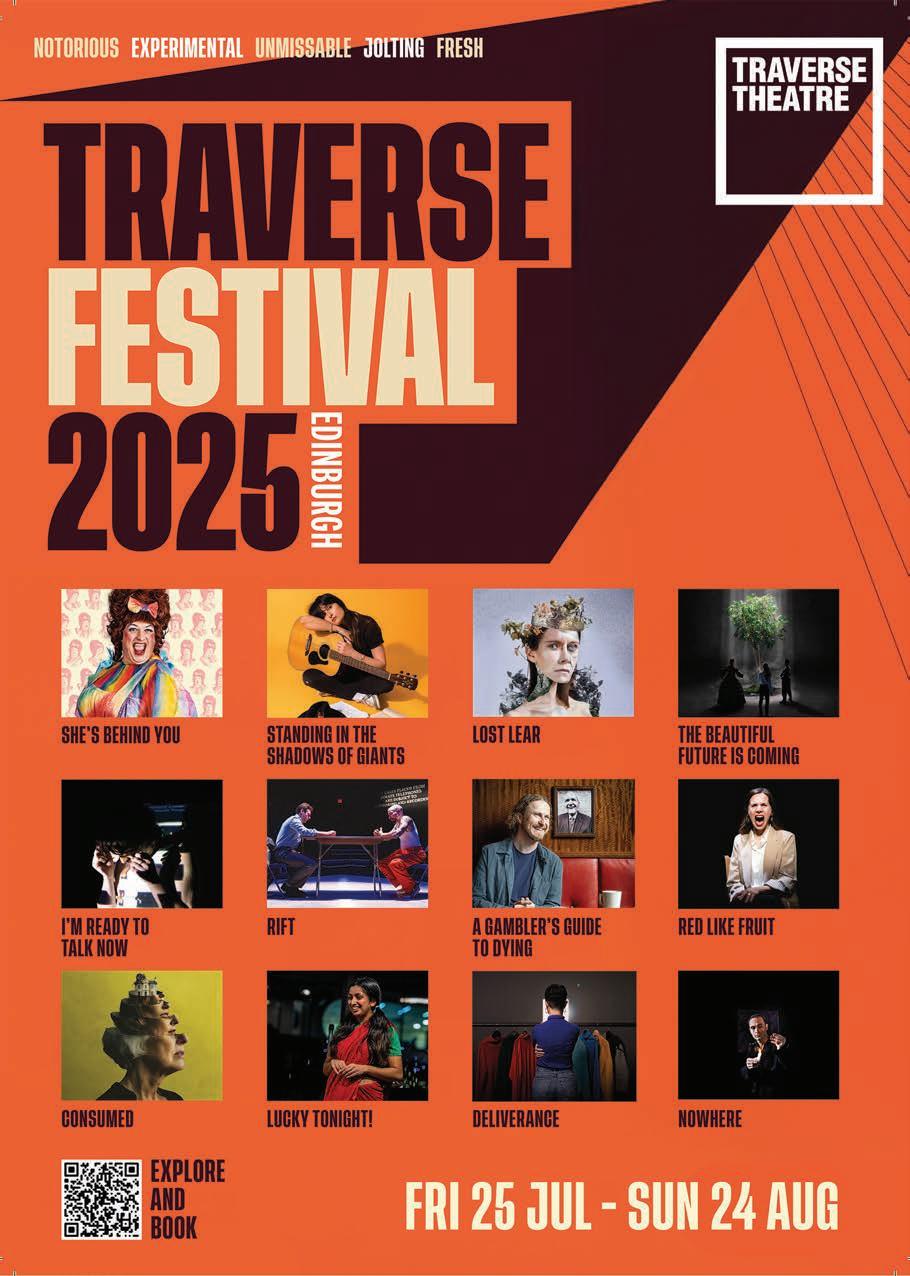 Urooj Ashfaq, and groundbreaking Scottish folk musician Mairi Campbell. Elsewhere in this issue, you’ll find an introduction to Welcome to the Fringe, Palestine, arguably the most urgent showcase of this year’s Edinburgh Festivals, as well as conversations with Francesca Moody on the resurrection of Shedinburgh; the team behind the Edinburgh International Festival’s dementia-friendly concert; and some up-and-coming stars of Scottish comedy and theatre.