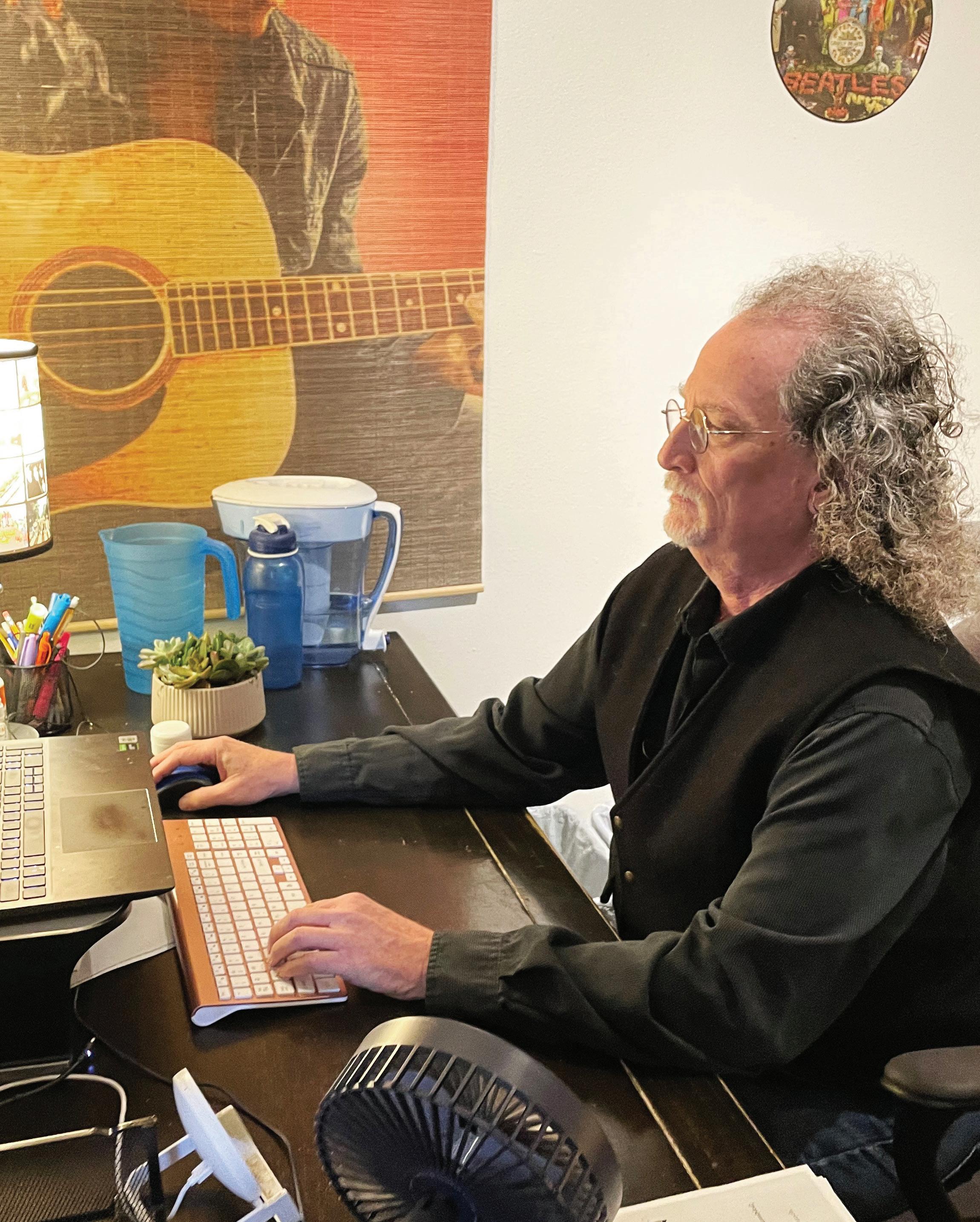Page 4: Robert “Bob” Kristy, HUGGS Coordinator and Clinical Supervisor pictured at his computer under the watchful eyes of his Bob Marley poster.