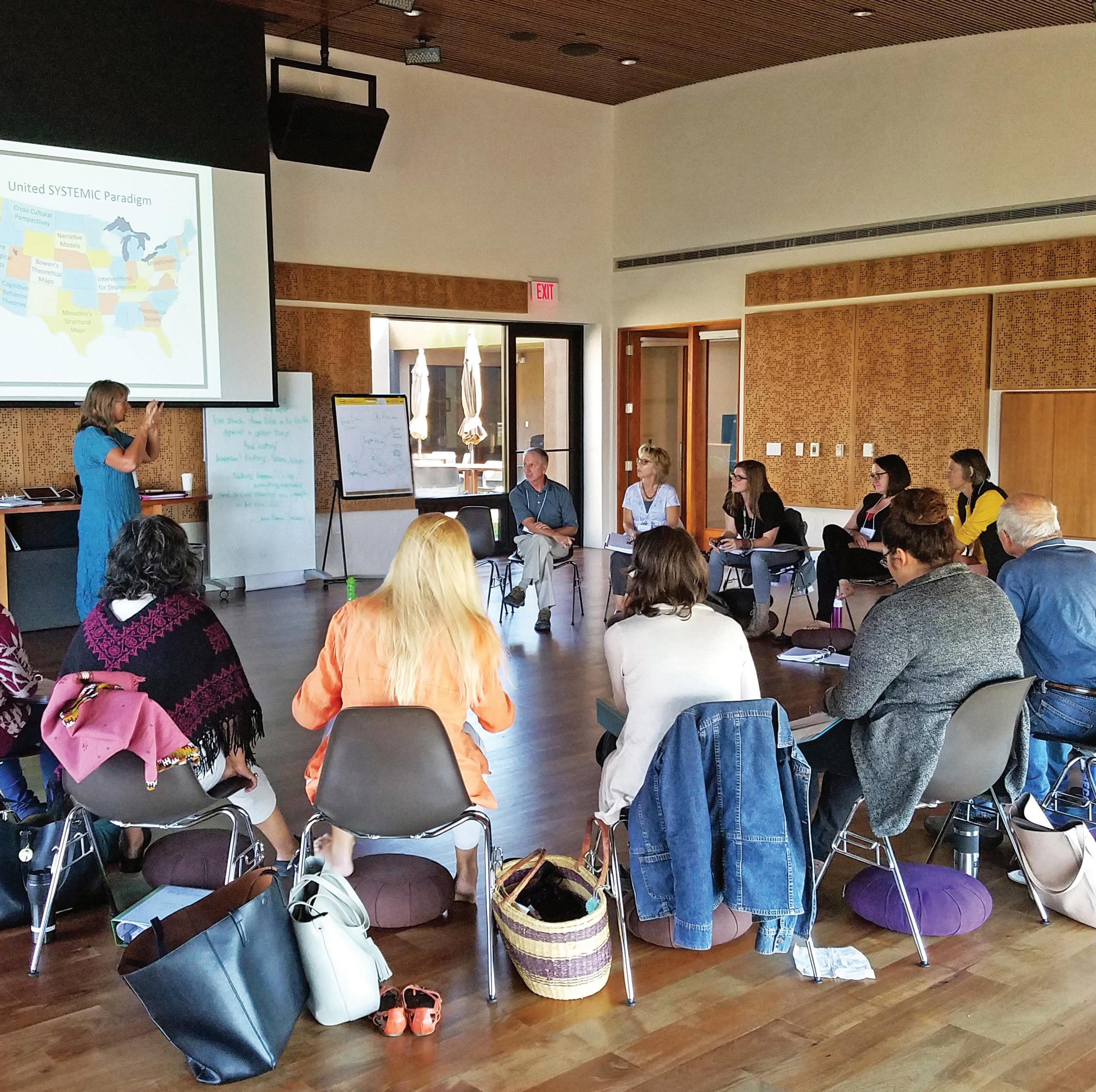 Page 18: Founding Executive Director Apryl Miller presents as part of the Graduate and Advanced Studies Orientation. Photo: The Sky Center archive.