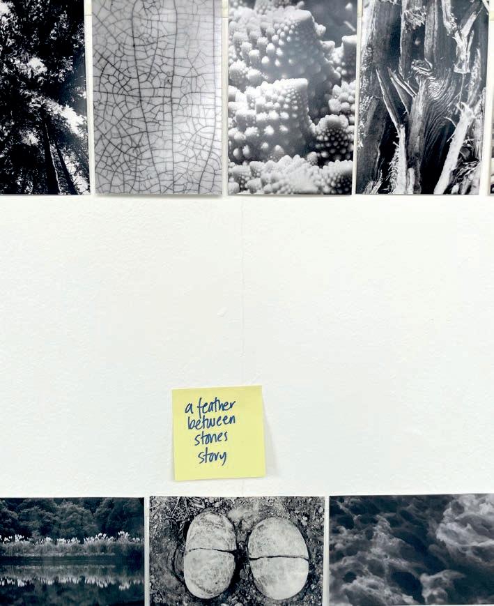 and transitions, such as paths winding through forests or bridges stretching over rivers. Others focused on the interplay of light and shadow, exploring ideas of contrast, liminality, and the spaces between actions or events. They were asked to play, collect, and arrange the images, and then reflect on the themes, questions, and concepts that emerged. Themes such as exploration of the senses, exploration of liminal spaces, the unknown, the in between, the pause, journeys, transitions emerged. Questions like...what it is crux of your story?....what is the moment before the turning/ the telling? the moment before sunrise/ sunset? How do we move between one thing and the next? What happens in the in between spaces? As themes emerged and possible contexts and uses of the image emerged the students found additional images to add to their collections.This process became a flow between the interplay of the cognitive mind and playful intuition. This approach highlights the value of letting images “speak” before engaging the cognitive mind or forming thoughts and concepts.