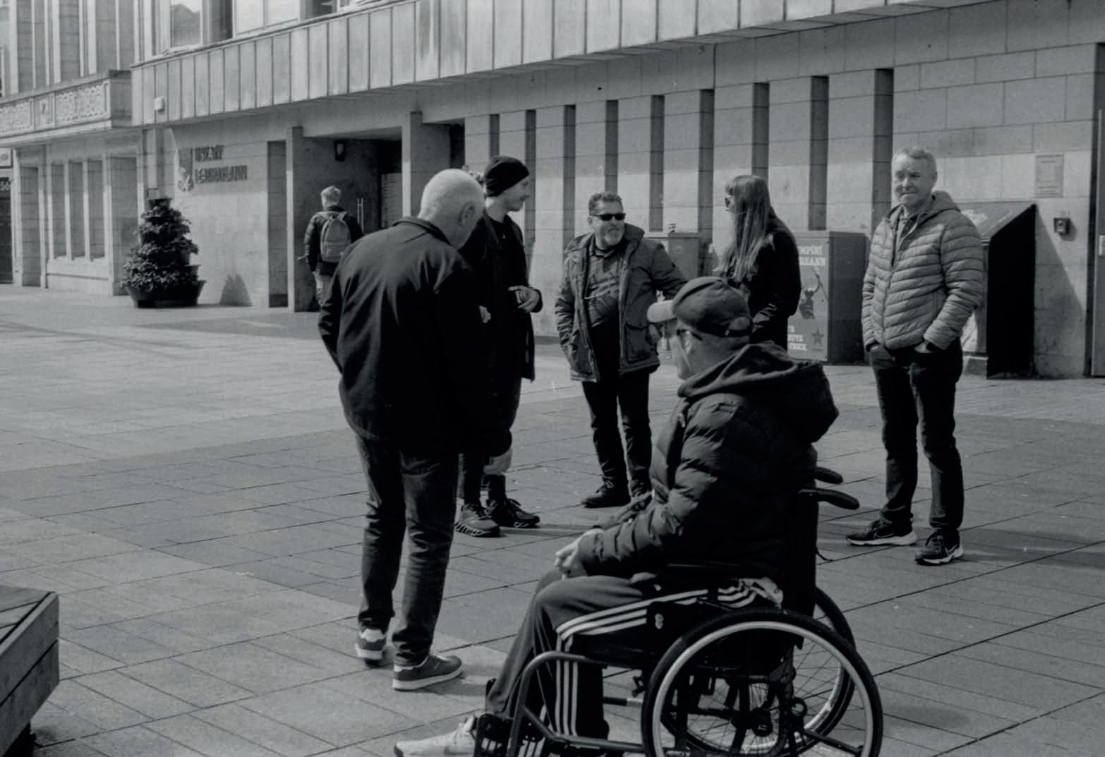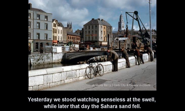 Collins statue and tree-lined streets, finding quiet encouragement to tune into the birdsong and settle into his surroundings. Finbarr reflected on Cork’s evolving identity, questioning how we might preserve the city’s character while embracing change, adding questions to our collective archive. Ger grounded our exploration in memory, sharing stories of old Cork and its layers of history. Joe moved with openness and curiosity, adding each corner to his own personal archive, as if the project had granted him permission to pause and notice. Justine’s deep appreciation for beauty highlighted the litter marring the streets, sparking her wonder at how anyone could neglect this beloved city. Kristian reminded us of our place on the island itself, anchoring us in Cork’s southern essence.