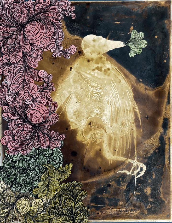 Elize organised her grandfather’s slides into three categories: natural landscape, man elements, and industrial elements. She layered these elements over each other to create photo etchings. Toyobo photopolymer plates were used to preserve the photographic details in the layers. Antarctic Archive III (2024), for example, has three to four layered images consisting of three elements: