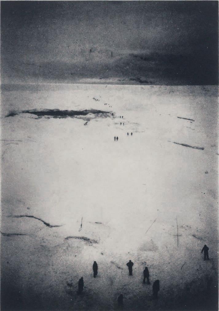 In Antarctic Archive V (2024) there are people in the foreground, one with arms on hips, and in the background people appear to be marching off in pairs. There is a horizon, and on first glance