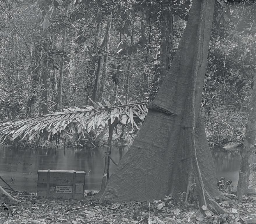 Then, in one of the photographs, I see a wooden box standing under a giant tropical tree. The photo has been scanned in high resolution and I manage to zoom in. With some difficulty, I can read the inscriptions and labels on the crate. Oxford University Expedition to British Guiana. There is some more writing on the crate: passenger to Demerara. At 346 kilometres, this is the longest river in the South American country, flowing into the sea near the capital Georgetown.