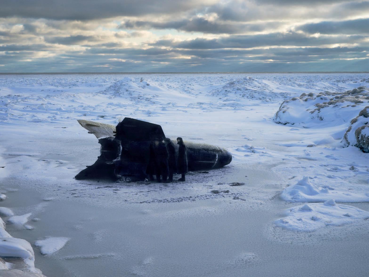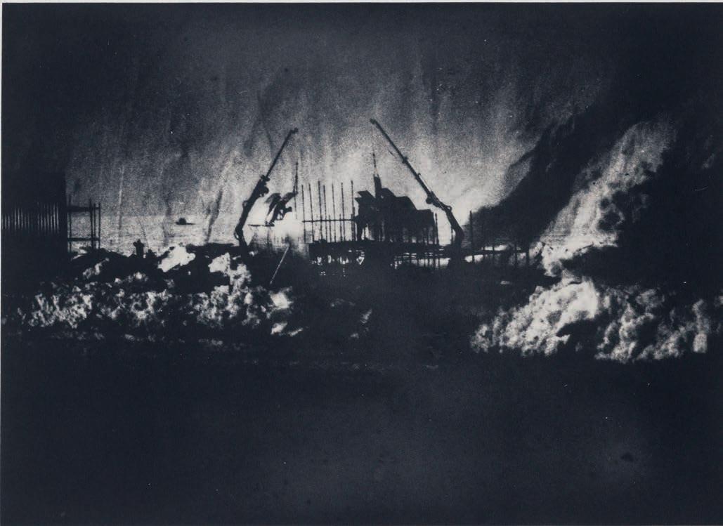 there is only sky above, but in fact there are more figures layered on glaciers. In Antarctic Archive IV (2024) a ship is in the foreground – again a horizon is layered with a glacier which cuts out part of the ship, to me reminiscent of what a child would imagine a ghost ship to be, semi translucent moving alone on the horizon. Antarctic Archive I and Antarctic Archive II (both 2024) have structural elements which presumably Willie engineered; they are layered with glaciers, and the effect is a pair of dark images in which the world could be described as burning.