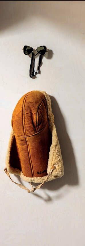 emperor penguins, a ship, and glaciers. As a result of the layering, it is not clear, penguin aside, what you’re looking at. The effect is eery, ominous, and presents a dystopian vision of the Antarctic. Walking into Cork Printmaker’s what you immediately connect with is Elize’s love and admiration for her grandfather. After his death, each of Elize’s siblings and cousins selected an item of his clothing as a keepsake. Elize the eldest grandchild in her family, described her grandfather as a warm, sweet, kind and smart man. He taught her algebra. He had an explorative, creative, process led brain which Elize has inherited. Elize chose his suede fur lined snow hat and snow glasses. They are hung as you enter the space. Willie de Beer is written diligently on the hat.