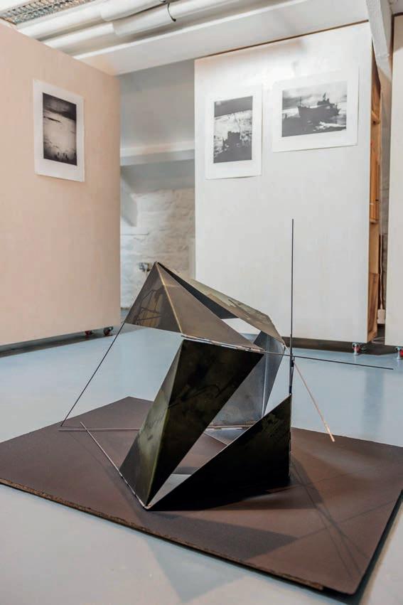 When exploring shelter types for the Antarctic he created an invertible prototype, a moveable shelter based on a hexagon, which turns in and on itself infinitely. Elize was fascinated by this as a child. The plates Elize used for these photo etchings are sensitive to humidity and heat, Elize spent months testing to get the prints right, and ultimately failed with the plates on the hottest and most humid day of the year. She decided to use the ruined plates to make another sculptural work, her own ‘hexoflex’. Invertible Landscapes (2024) sits in the centre of the room, the plates bear shadowy images of the Antarctic. It does turn in on itself, it’s angular and sharp, it is industrial and an eery reflection of the past.