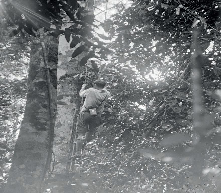 The British Guiana expedition takes place between 1929 and 1931. The expedition leader is Richard Hingston, a doctor who participated in the Everest expedition just a few years earlier with Mallory and Irvine, the two mountaineers who never returned from their climb to the highest peak. Hingston did return and then went on an expedition to Greenland. There, in the cold, the idea arose to organise a research trip to the warm tropics as well. In the British colony of Guiana, north of Brazil, they will map the flora and fauna in the treetops. They will sail up the river in canoes. With the help of locals, they build plateaus high in the foliage and record life in the upper layer of the rainforest.