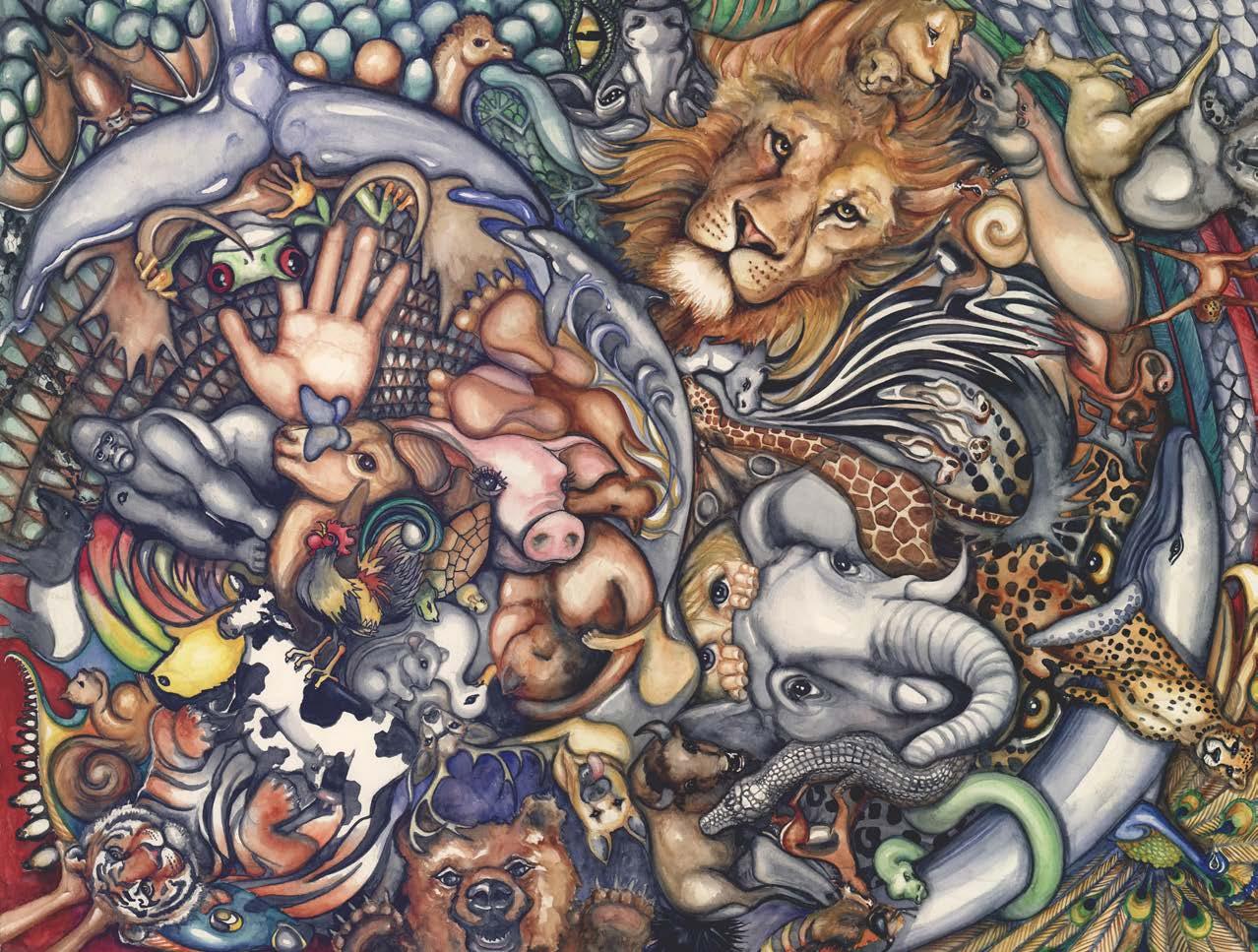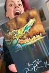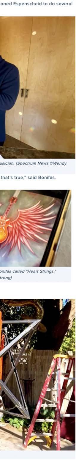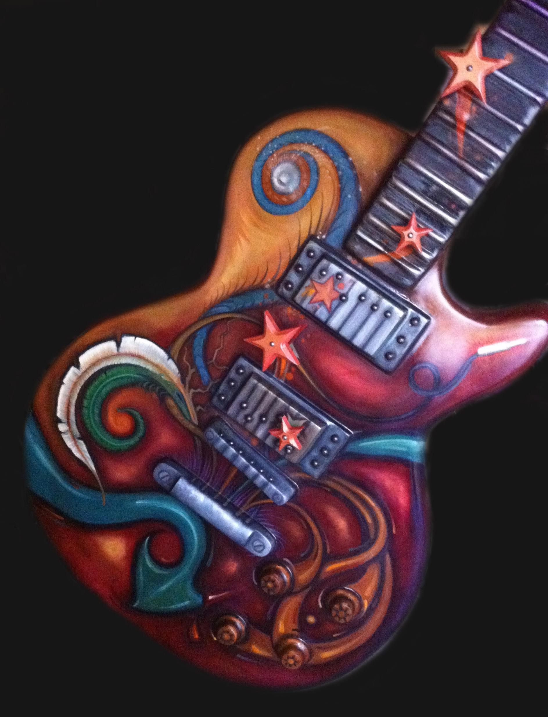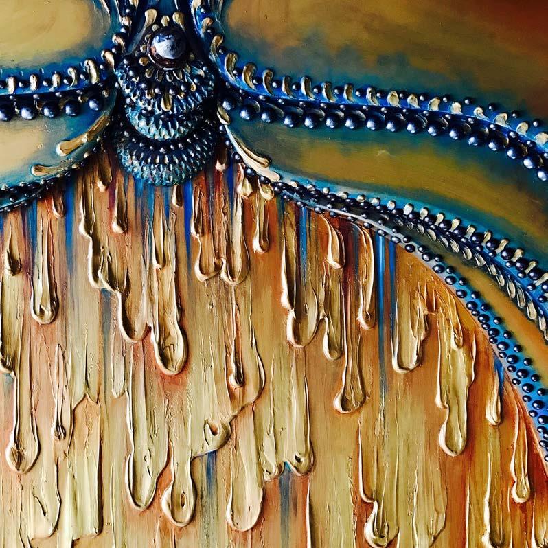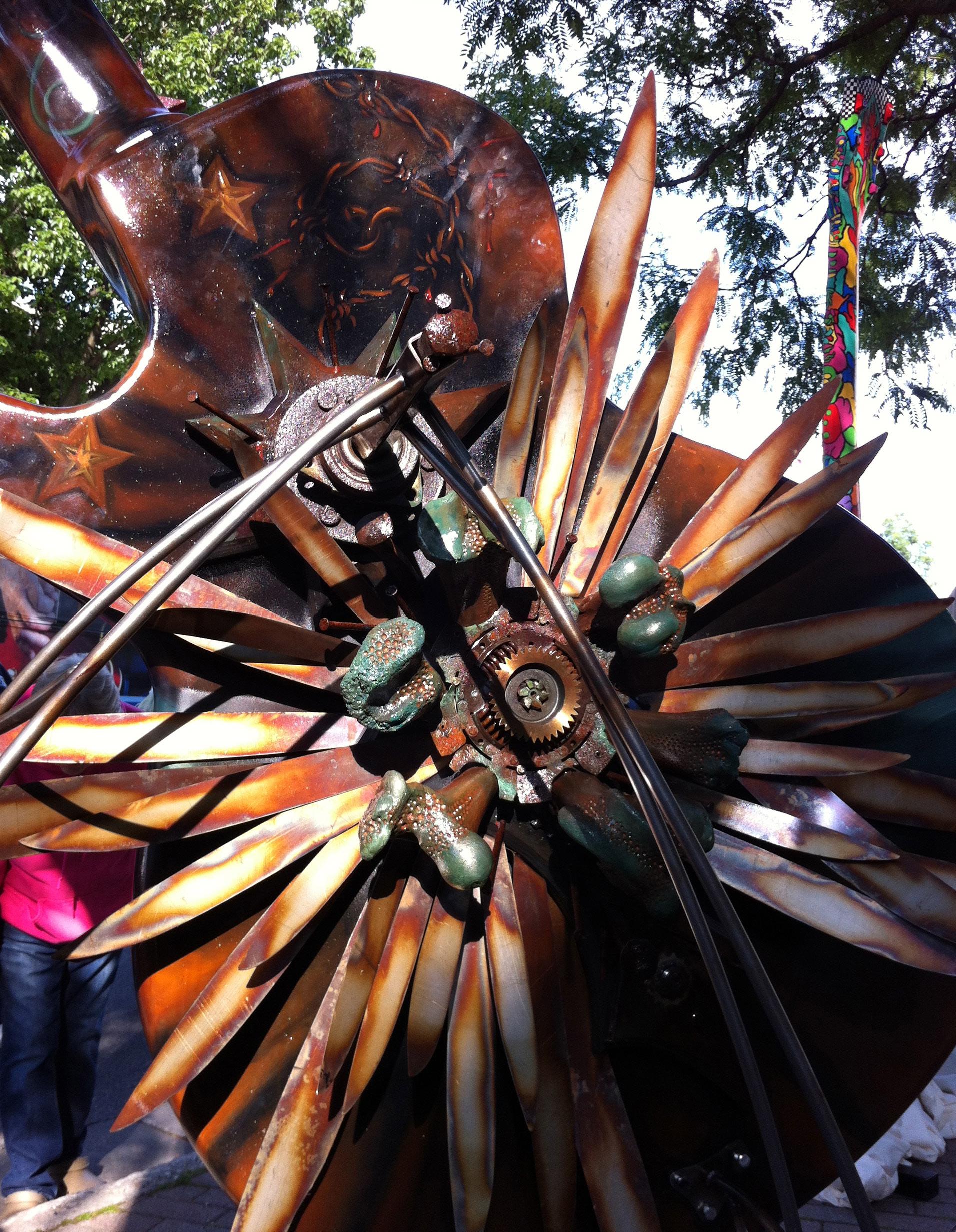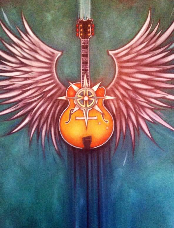Song Bird was commissioned by the City of Waukesha, home of Les Paul & US Guitar Town. Made of Metal, bone, artifacts, and oil paint on a 12’ fiberglass Gibson. It rests gracefully on a custom steel stand, full of juicy color and meaning. SongBird conveys the reality, or rather duality, of an Artist’s life. The outward persona/front of Songbird is us with our audience: juicy, energetic, inspiring & magnetic. It is juxtaposed with the back: the behind the scenes reality of work, creation, organization, practice, logistics…and sometimes literal blood, sweat & tears. The sculpture was deemed too dangerous to display in public and was bought by George Wang, owner of Waukesha Tattoo Co. where it is on permanent display!