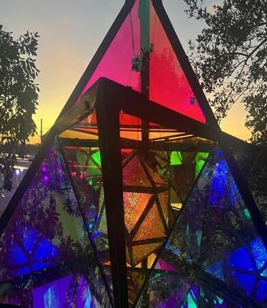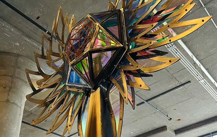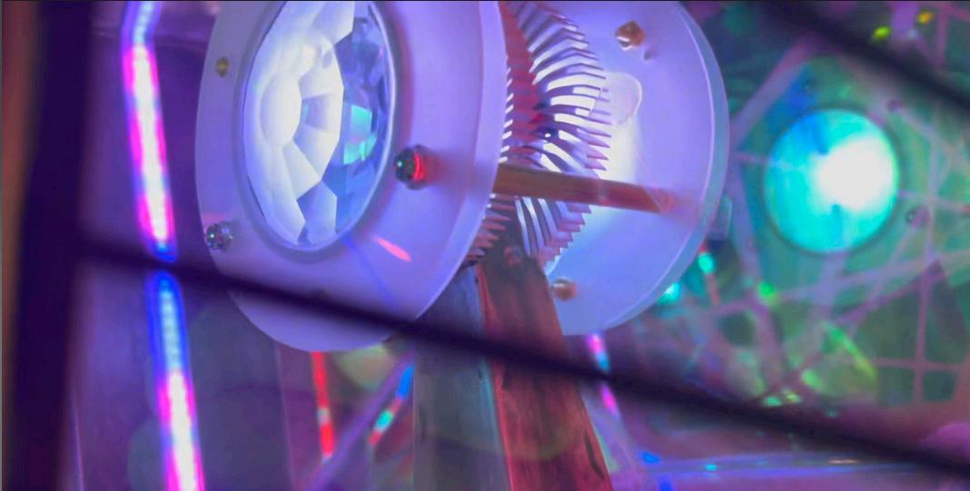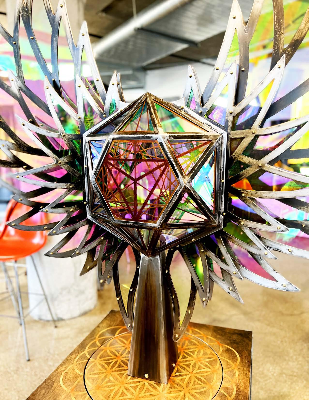 Luciferia- Bringer of Light. This Winged Crystal plays with the sun by day and interacts with music and programming at night. Made of Acrylite, an iridescent translucent acrylic, metal and electronic/lighting components. She/They have a Mythology, a vast wealth of information in Their Sacred Geometry and light play encoded in Her DNA & Heart (programmed in Her chip and crystal core).