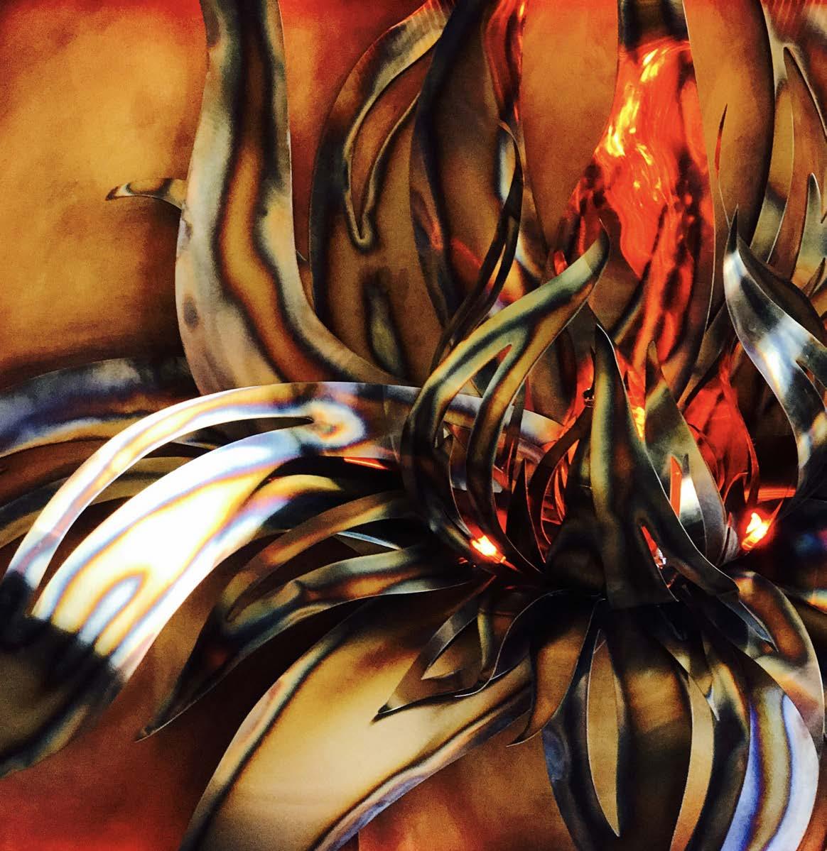Created as a memorial piece for this clients recently passed husband, the commission represents their unconventional love and eternal flame. With the deep grief of losing Her Husband on this physical plane, she wanted something dynamic to be with her as she moved through the stages of grief. Symbolizing their devoted relationship is the ever blossoming lotus, organically extending past the frame that usually defines a couple. In the center, near the undulating lights, is his wedding ring and below his remains- with her every day and night as she healed. After dark the spirit of Eternal Flame fills the space with dancing calming light, transforming the space into sanctuary. -Third Ward Milwaukee