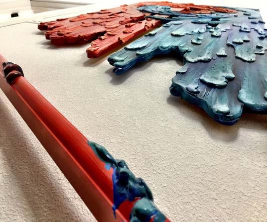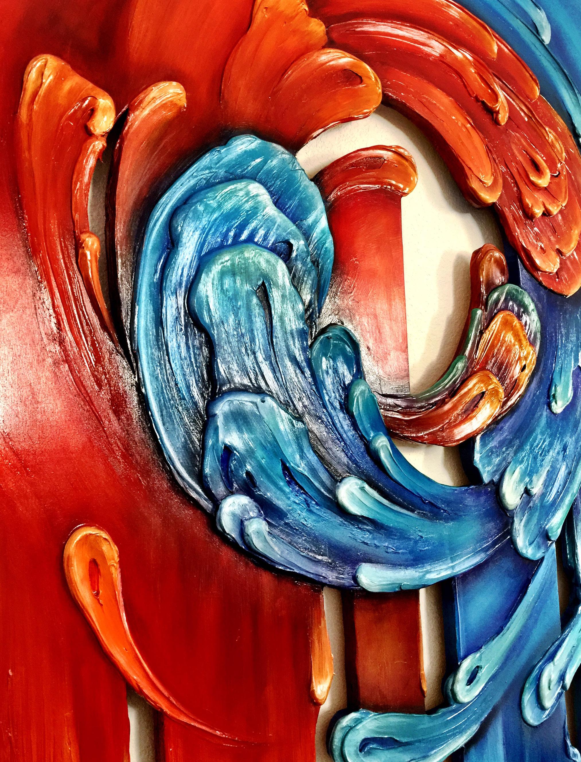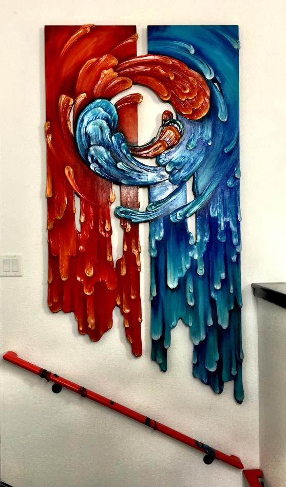 This wall sculpture was created for a Family that blendss cultures, desires, and lifestyles in a stairwell that unites the public and private levels of their home. The place between chapters, era, emotions and levels can be honored and celebrated. The top of the panels are angular, and as it descends the mediums seem to let go and flow with ease as they cascade and drops fall on the banister. The visual elements suggest that the merging of individuals (color remaining strong) does not need to take away from the relationships (shared flowing shape). The empty space encourages flexibility, allowing for more of the aligned unknown, transformation, and ease of movement. -MKE