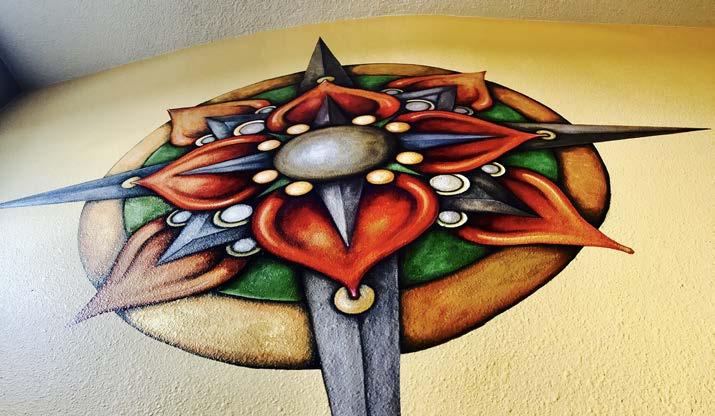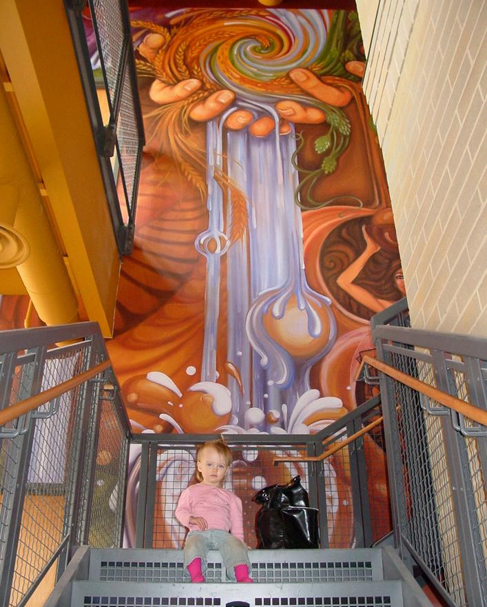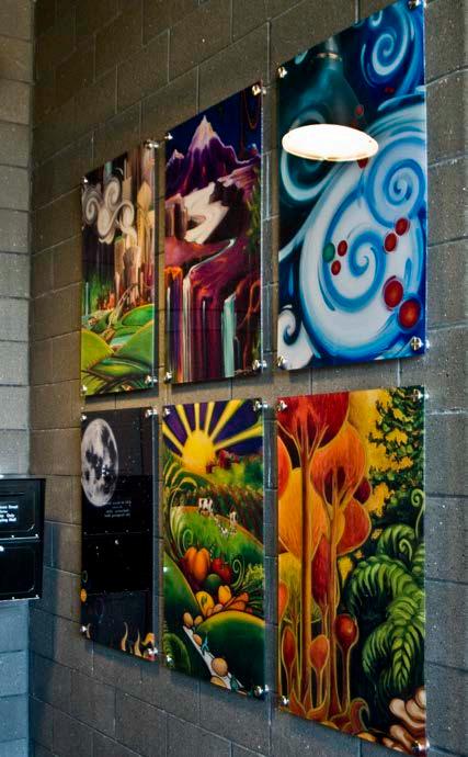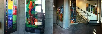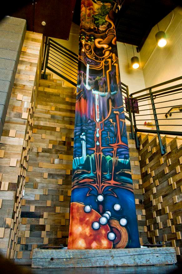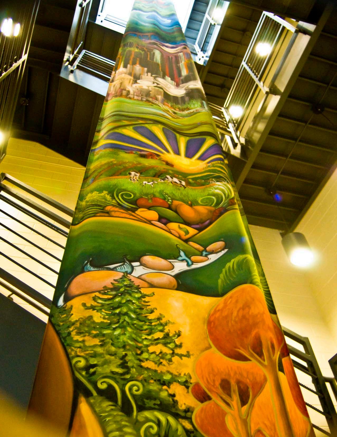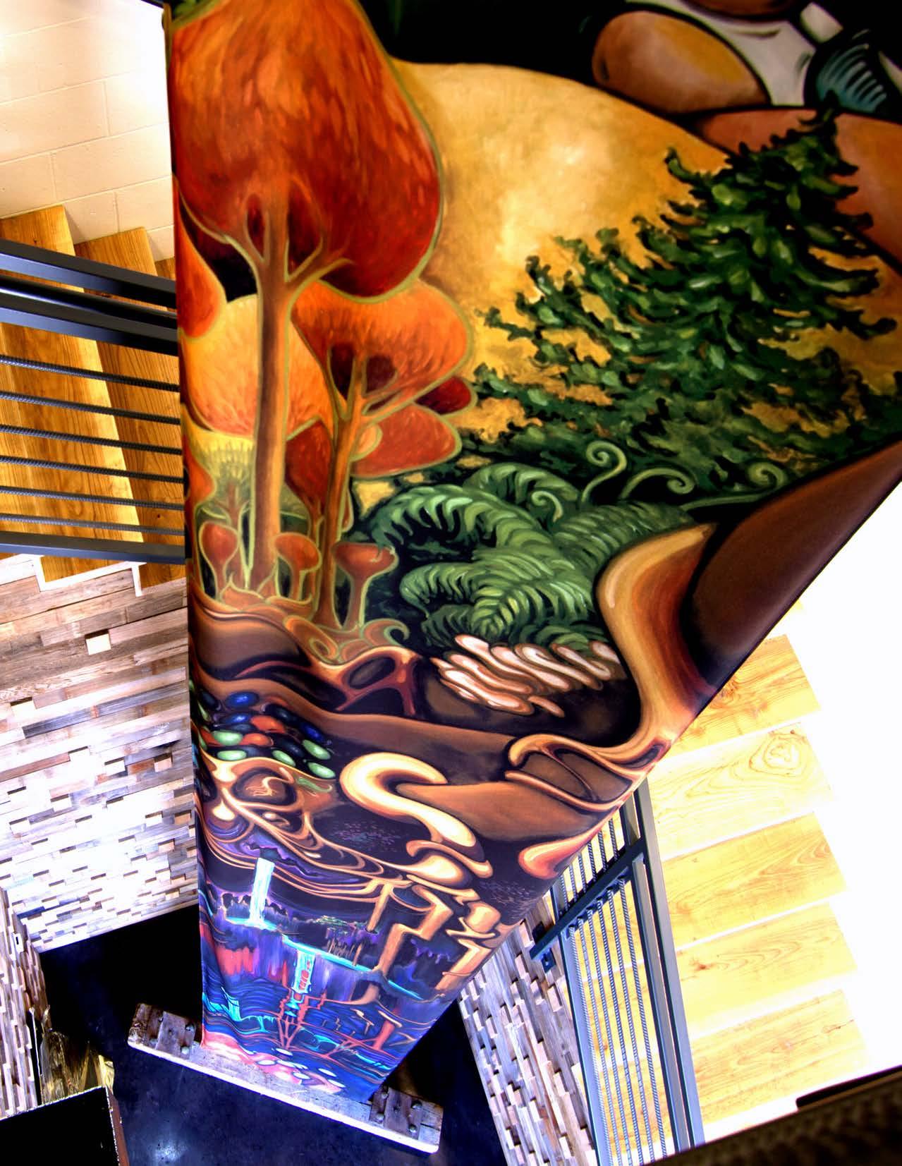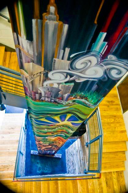 The Clock Shadow Building commission, ‘Green Ribbon’, reflects the wonders of our natural environment, beginning with the earths core and stretching through the solar system. The amazing structure at 130 W. Bruce St. in Milwaukee utilizes sustainable power and materials with community base tenets. From the original inspired oil painting that visually captures the importance of sustainability and the environment, the 75’ Green Ribbon Mural was created. It extends up from the ground floor lobby through the core spine of the building, the reclaimed wood stairwell, to the ceiling of the 5th floor. From the original art the interior and exterior signage, educational panels, & directories, were designed and reproduce to create a powerful clear and meaningful experience for all who enjoy the space. - Walkers Point, Milwaukee