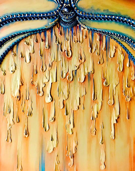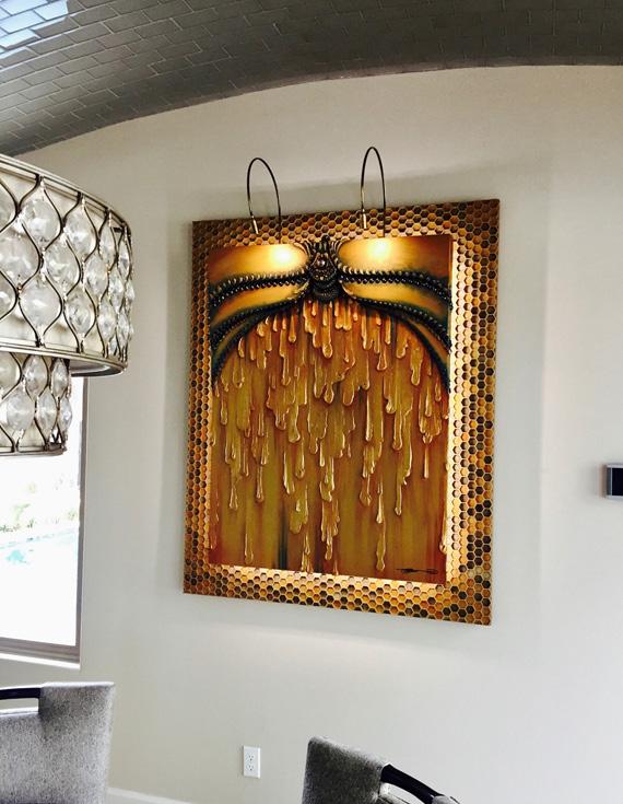To celebrate the completion of their new Home the Clients chose the kitchen as the first place for a commission. Combining the patterns of the tile, desired colors, and succulent feel- Honey was conceived. Light emenates from 3 layers of the art. It shines from behind the honeycomb routed and painted panel, is recessed between the 3D octagonal design and the front artwork of dimensional oils and metal, and washes the front with extending lights reminiscent of a honey bees antenna. The dripping texture and color result in an opulent, fascinating, and ever changing centerpiece for the Kitchen- the Heart and social hub of their Home. -Scottsdale AZ