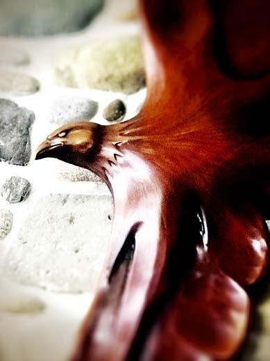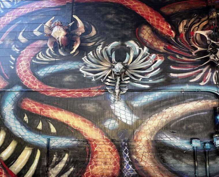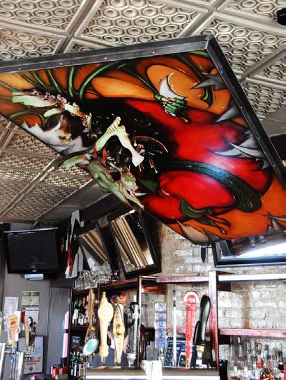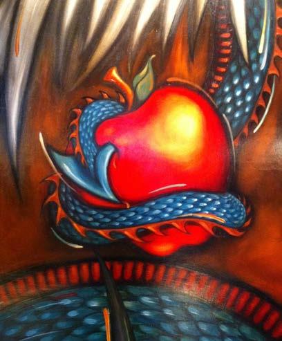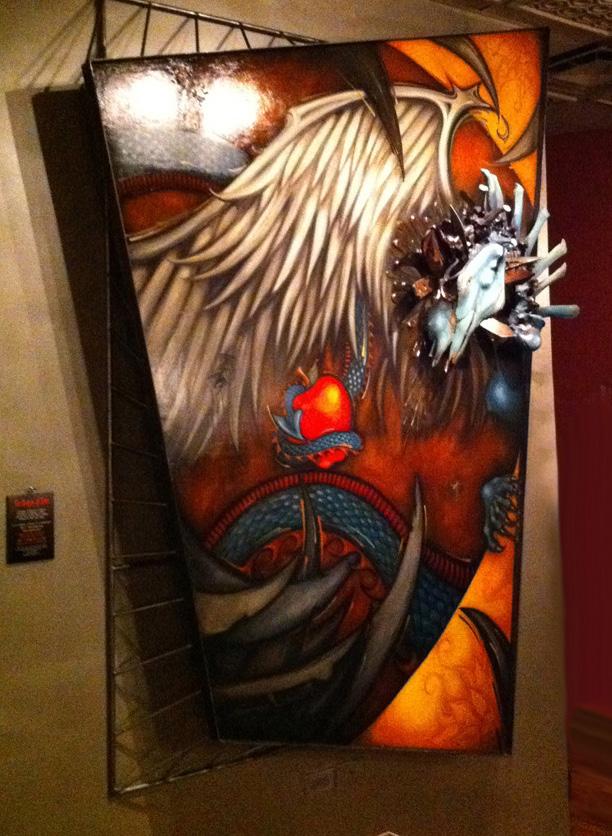 These wall sculptures of bone, metal, wood, and oil were commissioned by the owners of The Bad Apple, after seeing Jennifer’s work and trusting in her concept of matching their establishment’s vibe. The 2 huge dimensional works enliven the edgy corner spotone gracing the main dining room and the other suspended over the bar. Playing off the Garden of Eden & forbidden fruit the Dragon in one piece is capturing the Bad Apple and in the other can barely hang on. With vibrant color, carved organic material and found artifacts, the art is engaging and inspiring for the atmosphere, crew, and clientel they were created for. -4300 N Lincoln Avenue, Chicago