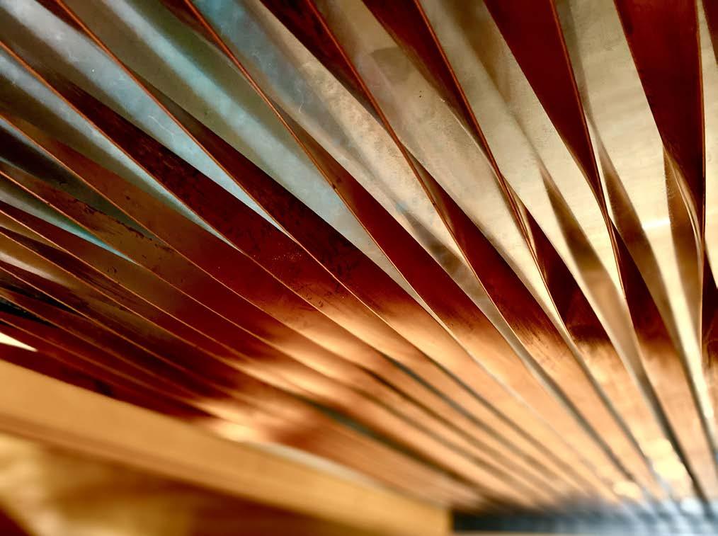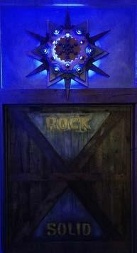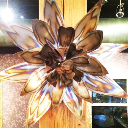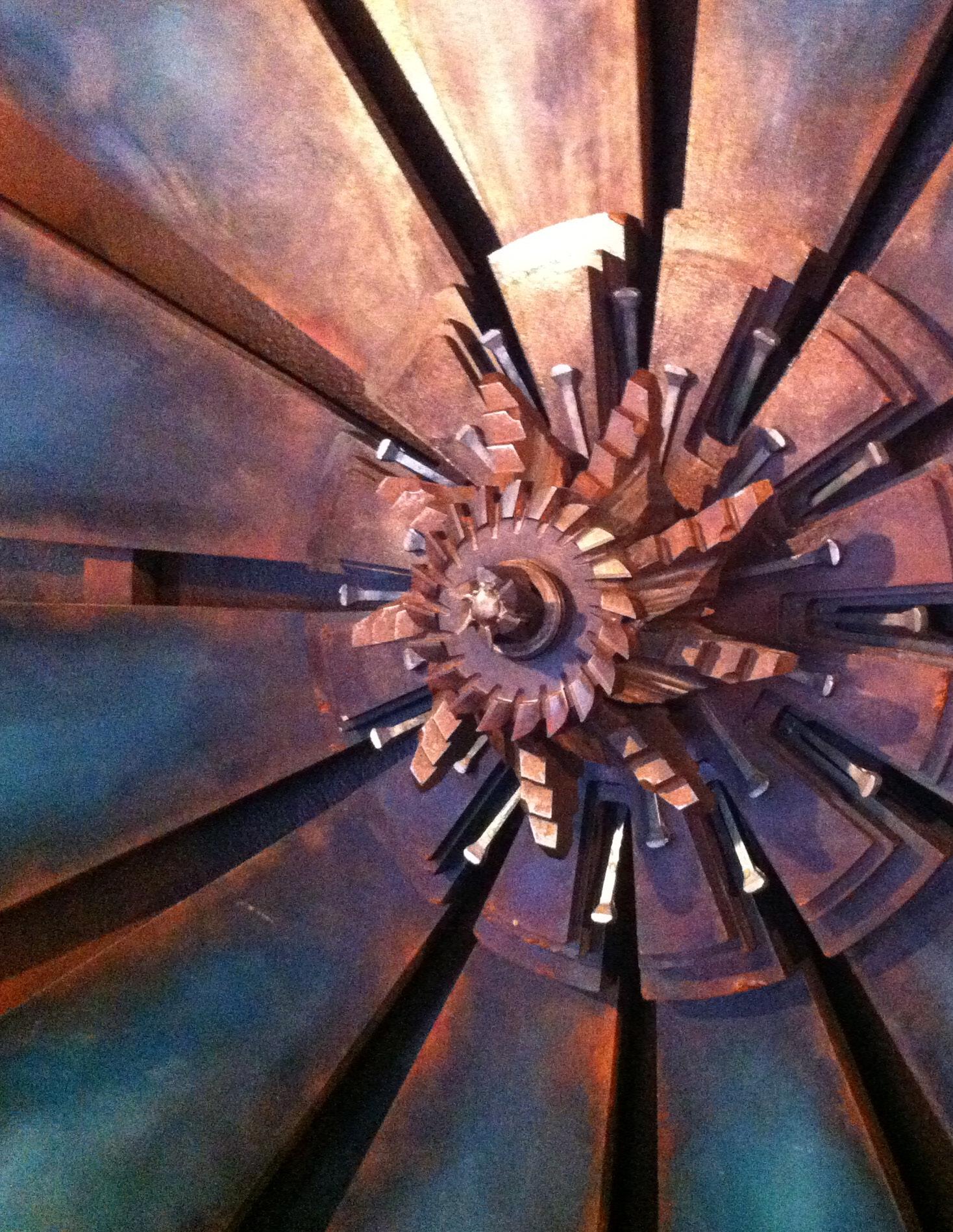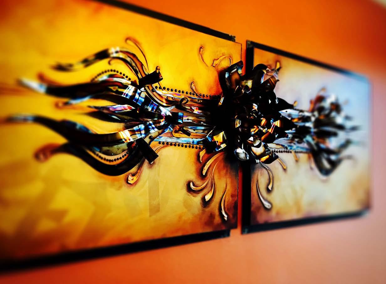 Clutch is an expansive sculptural centerpiece for the Restaurant of the same name. With a motorcycle themed lavish custom interior, the art pops with color, strong lines, and the abstraction of Her namesake. Set in an angle iron frame, the oil painted wooden rays emanate from the central hub of layered routed material and metal artifacts. The metallic surfaces glow in the light, conveying utility and authenticity while being elevated to the position of adoration and awe. -Milwaukee
