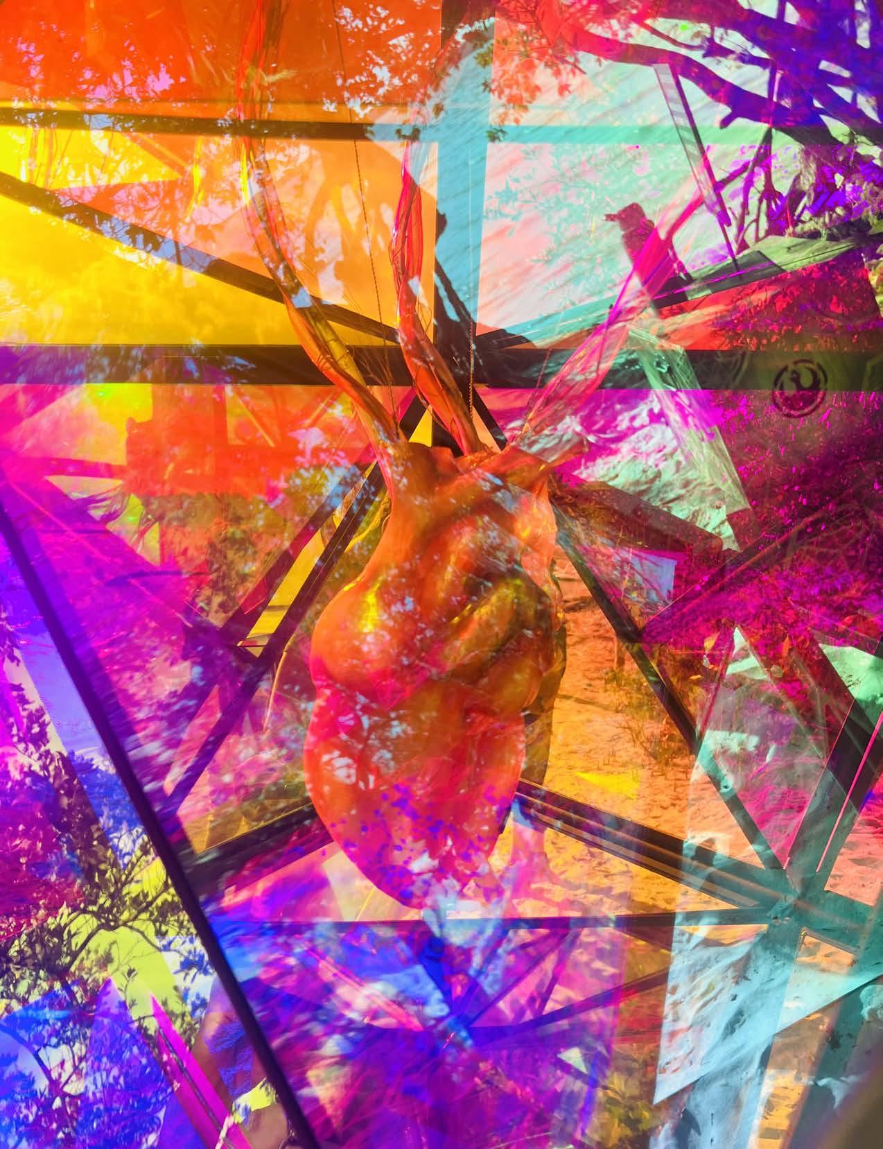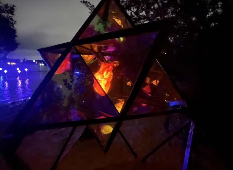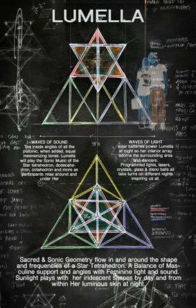 Lumella (Loom-A-Ya) means Light Star. This sculpture is an elevated Star-Tetrahedron of iridescence and metal. The shape is a protective chrysalis for an anatomical heartsomething every human has in common. This eternal symbol beats with light and dances with fire- reminding us of our inner tireless flame. By day the sacred shapes play with the Sun’s ever changing light. At night her center illuminates and casts movement, information and brilliance across the environment. With a glowing rhythmic Heart, an integrated sound system, and compelling music the experience is all encompassing & transformative. Lumella was commissioned through an art grant for Love Burn Miami, traveled to Michigan for Lakes of Fire regional Burn, and now lives on an estate outside of Mexico City