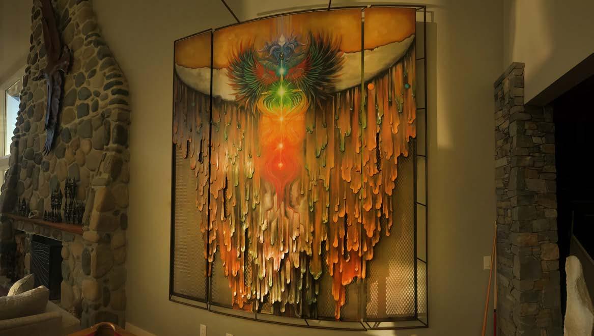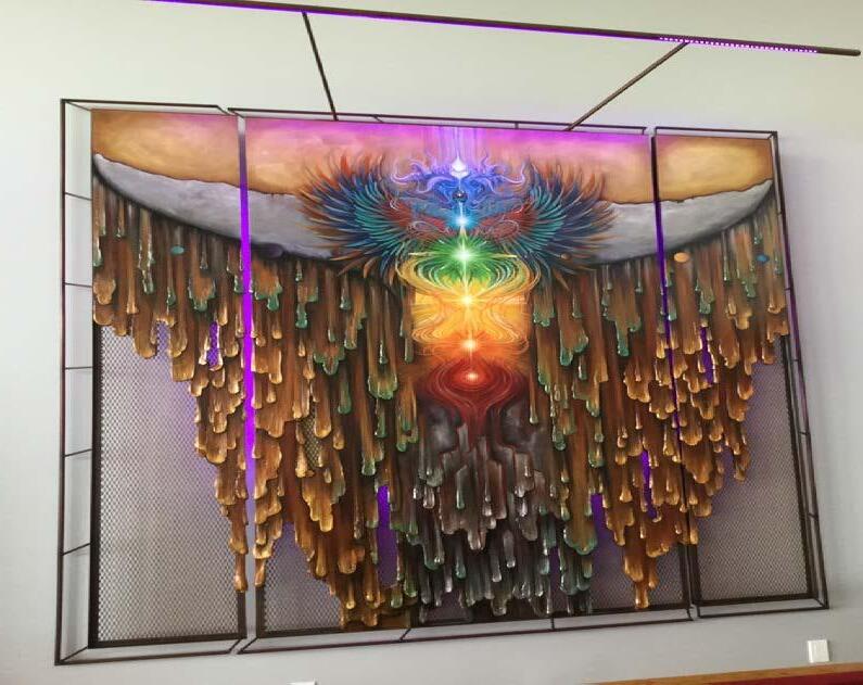This stunning Symbolic Portrait contains a pair of wings for each member of the Family backed by a whale Tail- something the clients see often in the views from their Vancouver Island home. This three piece sculptural oil painting is attached to expanded metal and set in an iron frame. The Chakras that form the spine light up with sunlight and glow and breathe at night in the ever changing programmable integrated lighting that extends from the top of the piece out and back at the shapes and symbolism. The viewer is calmed and mesmerized as the light hues move up and down the spectrum- energy seems to move and radiate as the Chakras glow from root red to crown lavender. From behind, the piece is illuminated and seems to float on the wall. Wonderful texture cascades down from the tail like honey and amber. OMChakra is a consistent and gorgeous reminder of their values & unification with the vibe of health abundance and radiance. -Vancouver Island