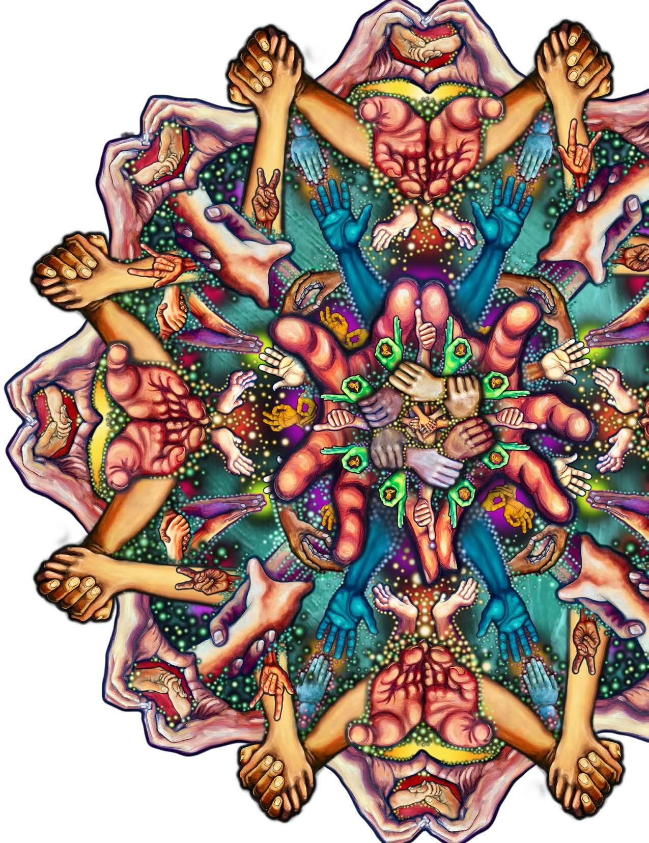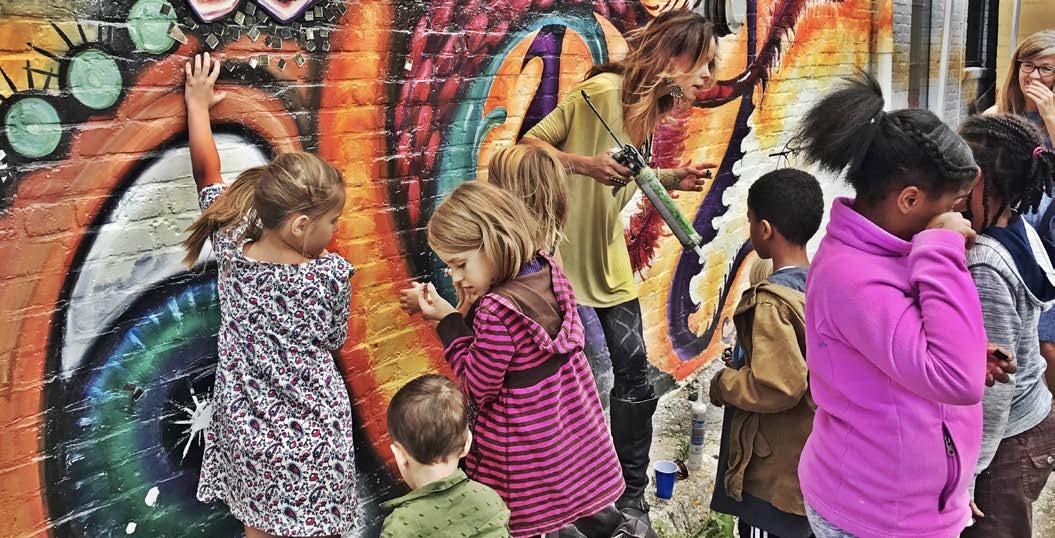 The Handala design won the commission to be the welcome mural for Clarke Square in Milwaukee. It is a combination of two of the Artist’s favorite amazing things, the Human Hand and Mandalas. Throughout human history, culture, and in every environment on Earth, Mandalas have been lovingly created. Hands are the extension of our hearts carrying out our work, touch, play and creating art. Fusing these two as symbols in the Handala both honored and inspired the neighbors in the Clarke Square neighborhood. This was a community inclusive project-- at a neighborhood festival hand portraits were taken of people of all sizes and ages. Next, Jennifer painted hand portraits in oil, captured the images and arranged them digitally into an elaborate mandala- the Handala emerged. This was printed on dibond, installed, and the rest of the mural was painted around it. On the day of the public celebration children from the area adhered mirror ‘seeds’ that Jennifer had hand cut around the centerpiece to symbolize the effects our actions have on our environment. To plant the ‘seed’ that what we do matters and be vigilant that it is beautiful. The inauguration with the Mayor kicked off a new fresh path forward for all the residents and building owners. -Clark Square, MKE