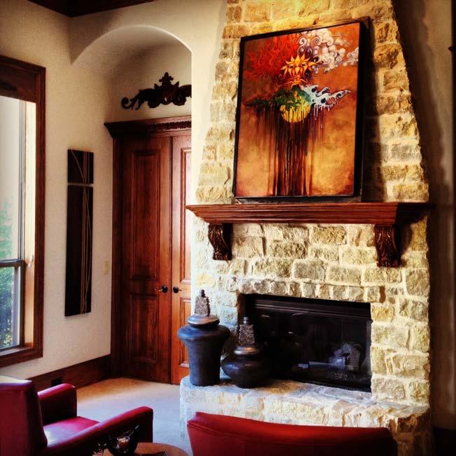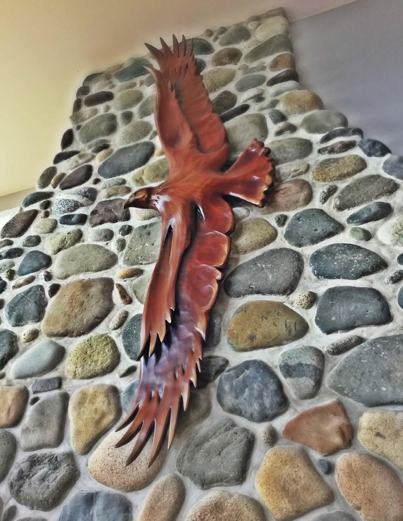 This piece was commissioned to soften the stone fireplace that dominated this open living space and convey a sense of freedom. The client loved the idea of a graceful soaring eagle with elegant vertical lines forever facing and flying towards the ocean. The rich colors chosen warmed the room and mind. -Vancouver