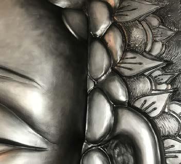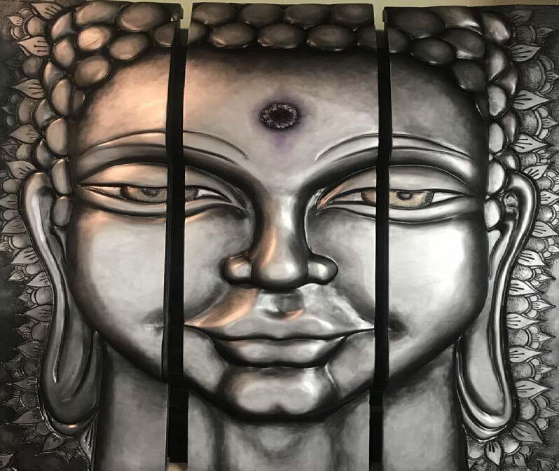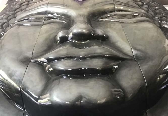 This commission of a serene Buddha face was sculpted out of high density urethane, layers of primer, oil paint, and a marine finish, which were applied to make it suitable for a zen outdoor garden gathering space. The metallic patina adds dimension to the timeless gaze and iconic traits of Buddha, as the powerful amethyst and quarts radiate from the third eye. -Vancouver Island, BC