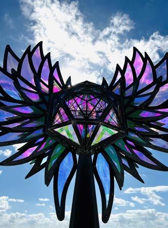 The sculpture’s central crystal body is an abstraction of Metatron’s Cube, symbolizing the Masculine, and grows from the Flower of Life, exemplifying the Feminine. It contains a multi-layered intricate heart, protected from the elements, which pulses and interacts with music and viewers. From this heart extend Wings, signifying freedom of movement and expression. Luciferia is a reminder to burn bright and continues to light up minds and hearts at Burning Man Nevada, Love Burn Miami, and now home in San Francisco CA.