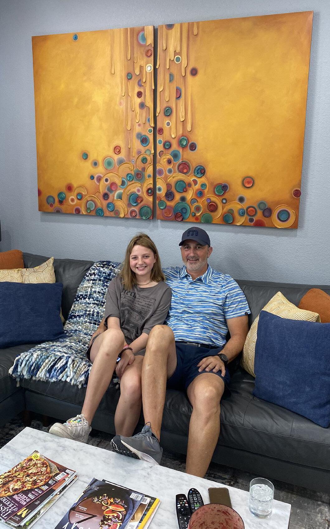 As this Family transitioned from their home in Mill Valley to their forever home in Healdsburg they wanted a piece of art that tied the two together. This piece would anchor the meaning of Family and Home for two years while the new home was being completed. Home is wherever the four Family members gathered and each is represented in the four quadrants of the painting, symbols of their essence portrayed in the landscape, and at the center a compass and doorknob. Symbolically and literally showing them their way home is a lock with keys dangling on chains that will always grant entry. The colors and size were carefully selected to grace a specific wall in their first home’s open living space. Later the wall in the new Home was sized for the Art! The content and energy of Eternally Home brings joy and centered solace each day. -Mill Valley, CA