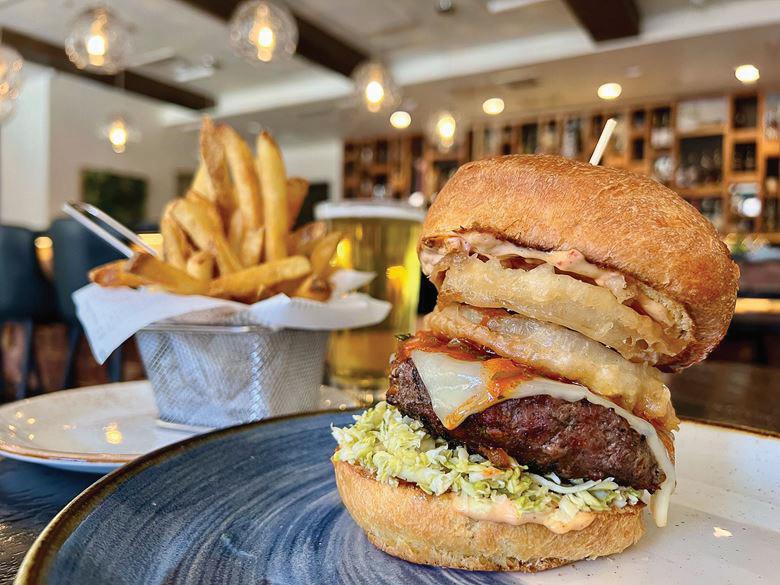 Grilled 8 oz brisket burger, yuzu aioli, tempura onion ring, gochujang relish, pickled cabbage, gruyere cheese, brioche bun.