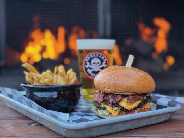 Two thin n' crispy beef patties, two slices of pepperjack cheese, pickle slices, onion rings, house-made bacon jam, burger sauce, on a pub bun.