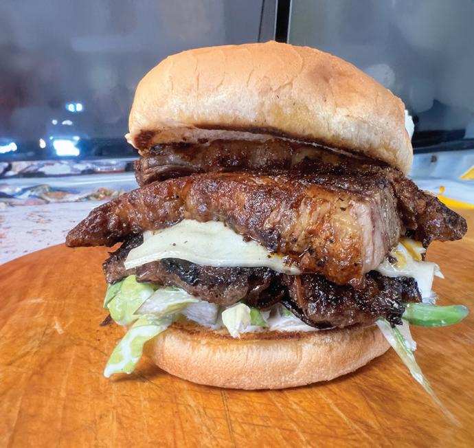 Well Rooted Farm smash burger, white American cheese, grilled shallots, dill pickle slaw, chipotle aioli and bun. PLUS free add on brisket!