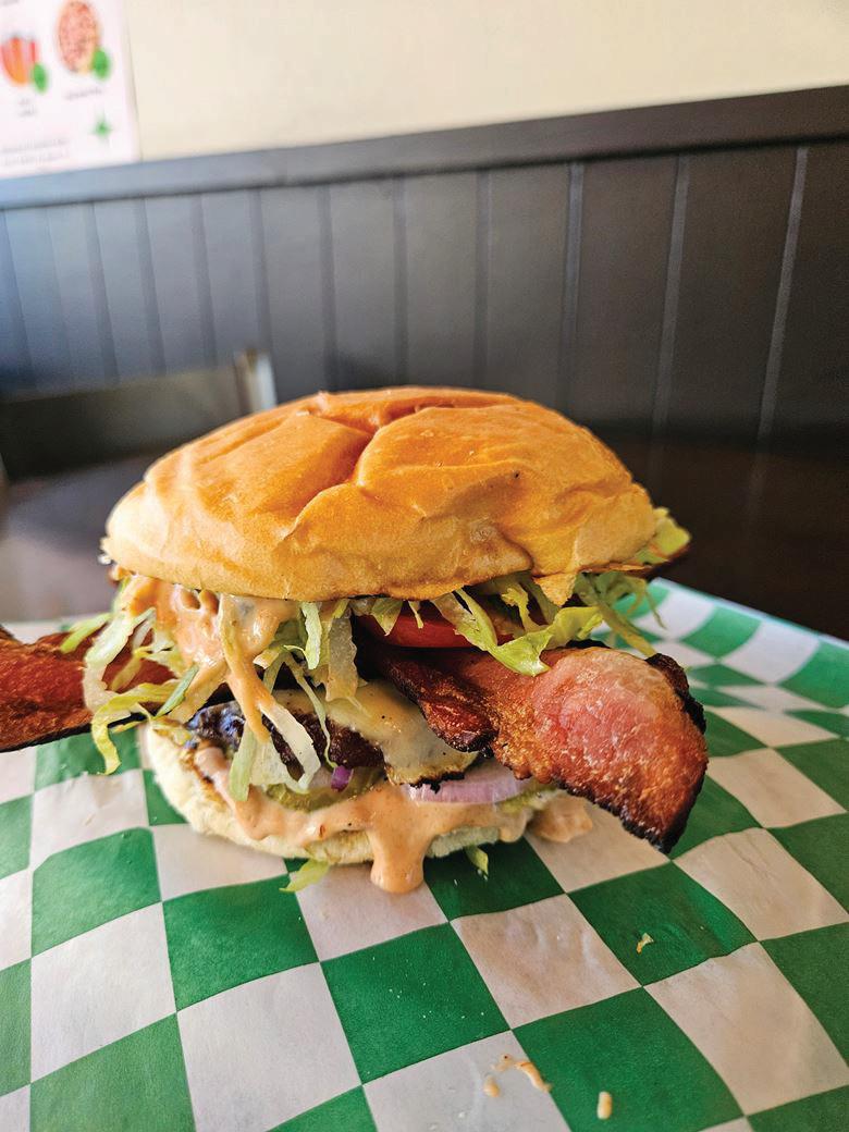 Featuring not one, but TWO juicy 3-ounce beef patties, this burger means business. It’s topped with gooey pepper jack cheese, delicious bacon, caramelized onions, crisp lettuce, fresh tomatoes, tangy pickles, and our famous secret sauce. Undoubtably a symphony of meat, cheese, and veggies.