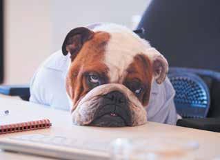 “I got the approval from everybody up top, and he’s been a good boy ever since,” Smelser says. “Customers love him. He hangs out here all day, and we go for walks and lunch, and he plays with everybody at work. He’s a good little stress reliever for everybody here.”