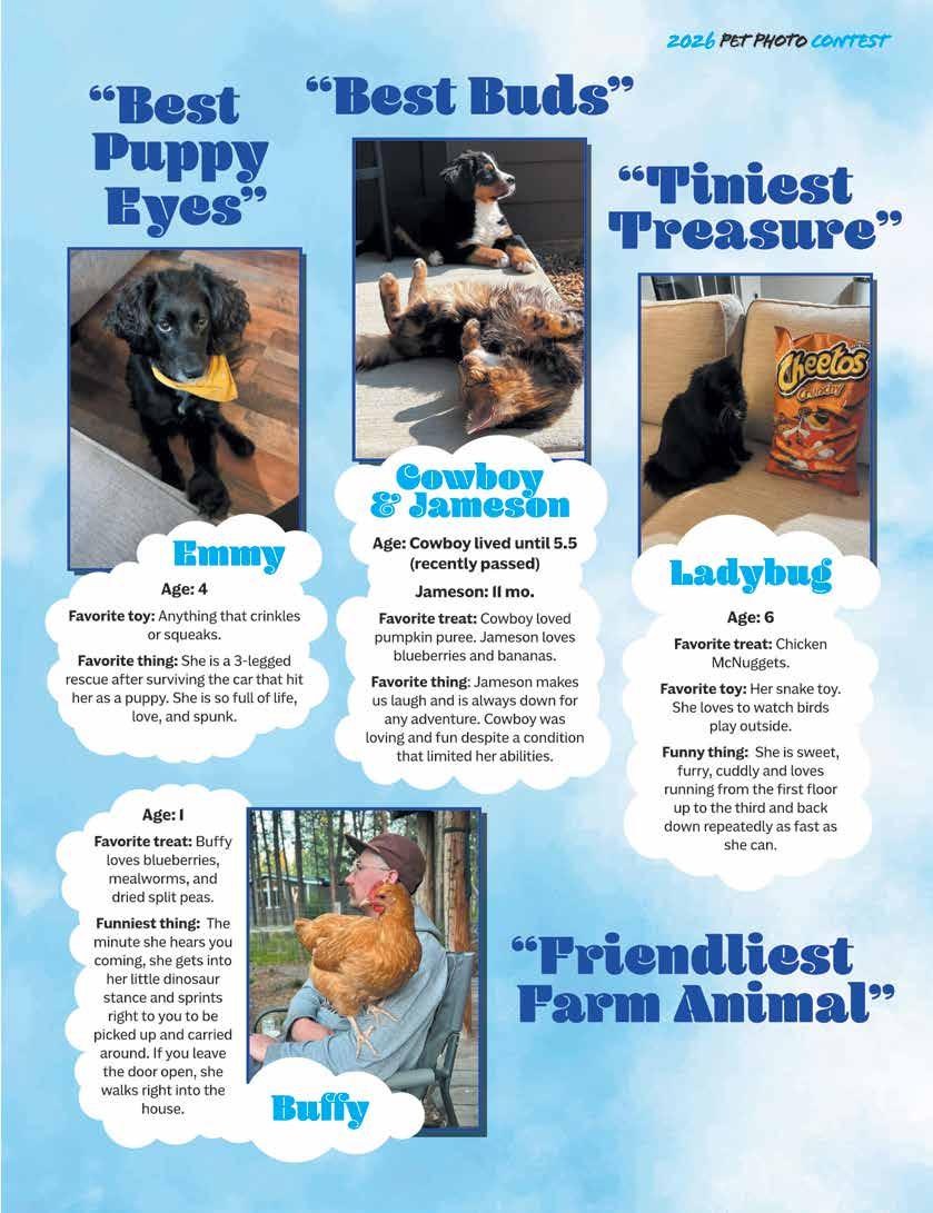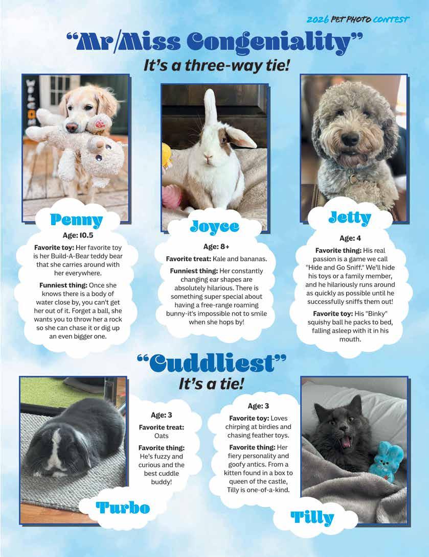I’ve always held a strong belief that my two dogs and cat have unique personalities, but after reading all the entries for the pet contest, I must acquiesce that other people’s fur-babies — and even feathered ones — are just as special. The paddleboarding cat on the cover seems remarkable as does the chicken that uses people as La-Z-Boys and the teeny black kitty named Ladybug whose favorite treat is McNuggets!