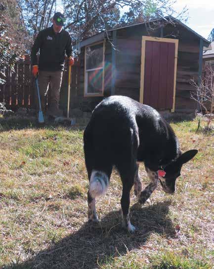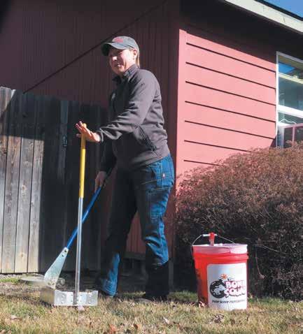On a recent morning, owner Brian Frankle, 48, parked his cheerfully branded work truck in front of a client’s home in Bend. From the bed, he grabbed a lined, fivegallon bucket and a custom, metal pooper scooper setup (a scoop and a poo pan combo), both with handles the height of golf clubs, which prevents bending over. (Frankle is proud of his work, which he welds himself; yet he asked that photos not be taken close up, lest an opportunist copy his design.) Then he began methodically pacing the rectangular yard as if he were a forensics investigator combing a crime scene.