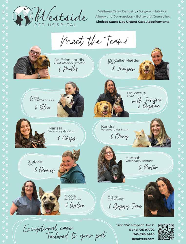 all kinds of animals.” With six dogs of her own, her pack can sometimes number up to 14, depending on how many fosters she has at the time. She has worked at Bend Veterinary Clinic for nearly 10 years.