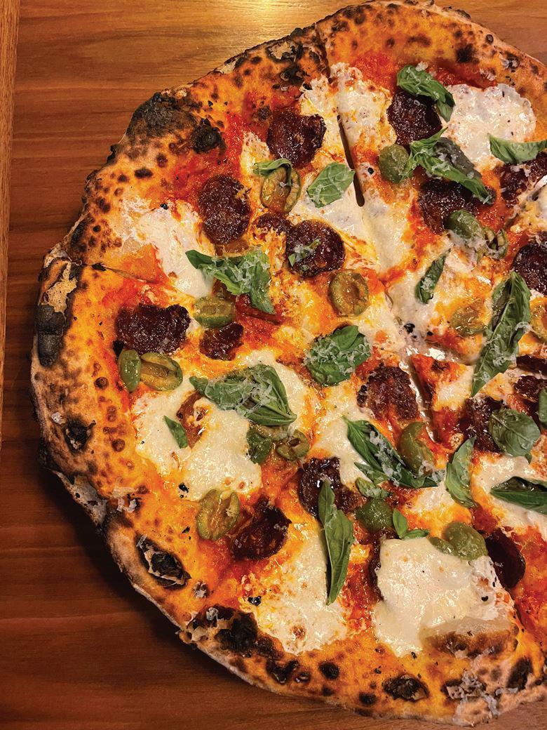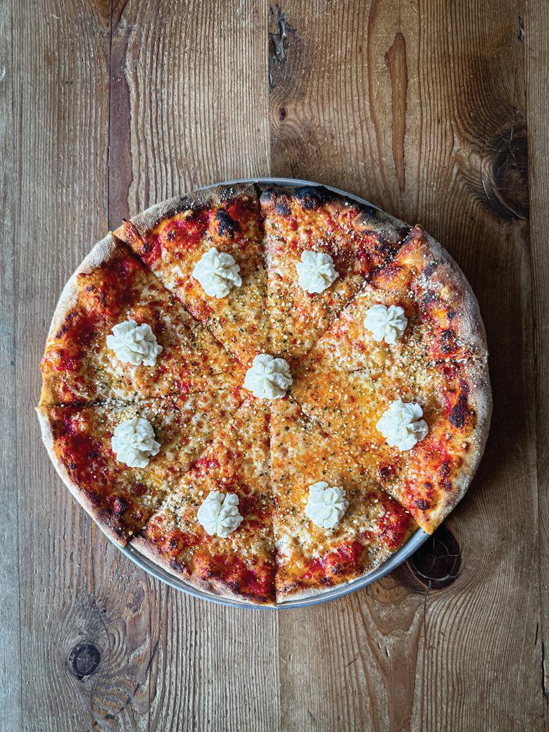 Calabrian chili–spiced red sauce, smoked mozzarella, Asiago, Pecorino Romano, oregano, and ricotta rosettes on our sourdough crust.