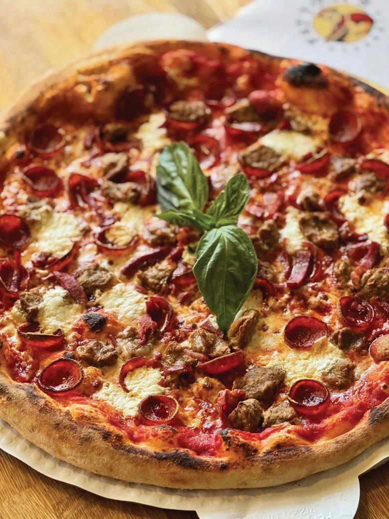 15" pie featuring house made fresh mozzarella, marinara, pepperoni, italian sausage, bacon, banana peppers, roasted red pepper, and red onion.