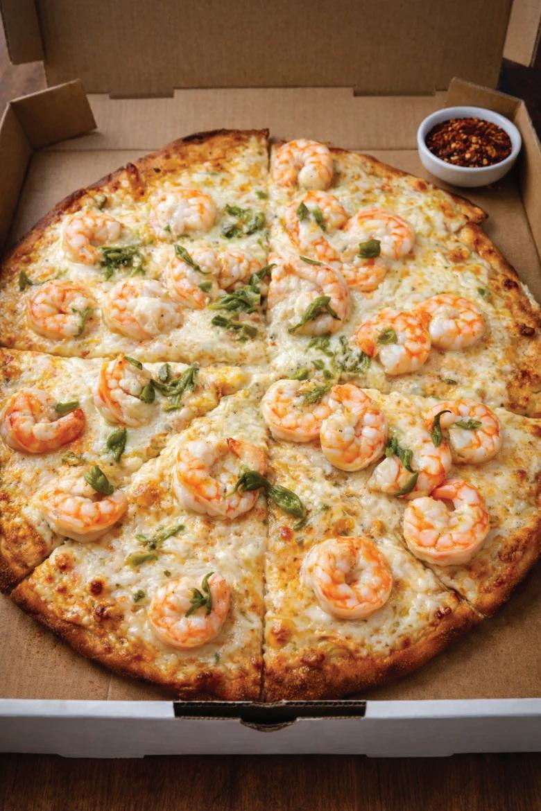 12” thin crust shrimp pizza. White, creamy sauce, whole milk mozzarella, 12 ounces of whole shrimp and topped with the loroco flower from El Salvador. Served with marinara.