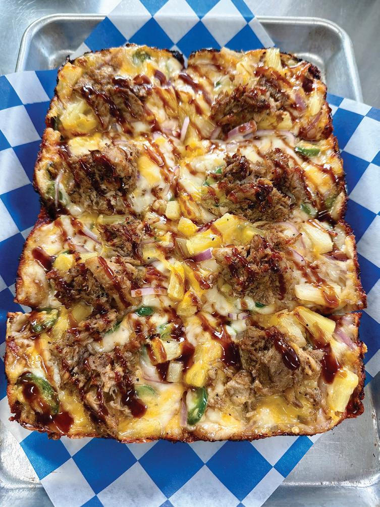 Detroit-style pizza baked with grande cheese, slow smoked chipotle pork shoulder, red onions, pineapple, jalapeños, and topped with our chonie cheddar blend and finished with house bbq.