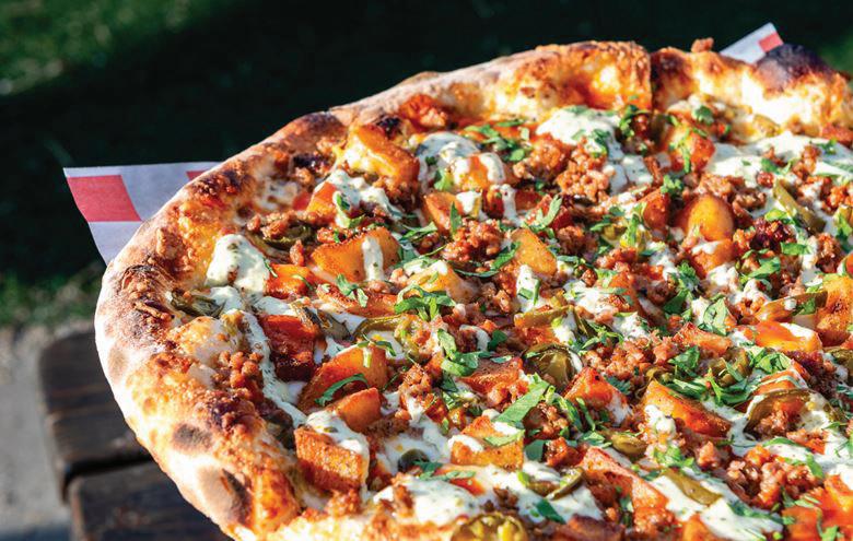 Spicy chorizo, crispy potatoes, tomatillo salsa, mozzarella, and Mexican cheese blend, finished with pickled jalapeño, cilantro, Cholula, and cilantro lime crema.